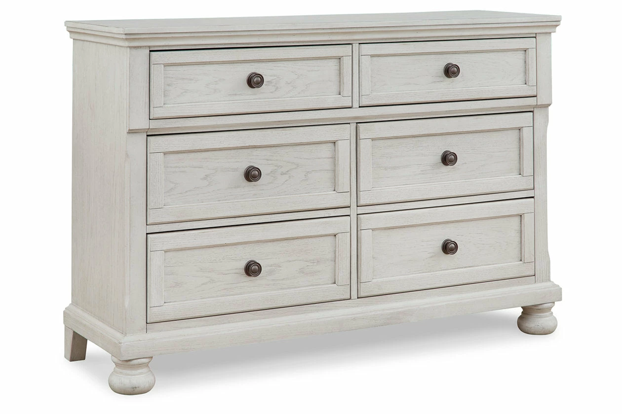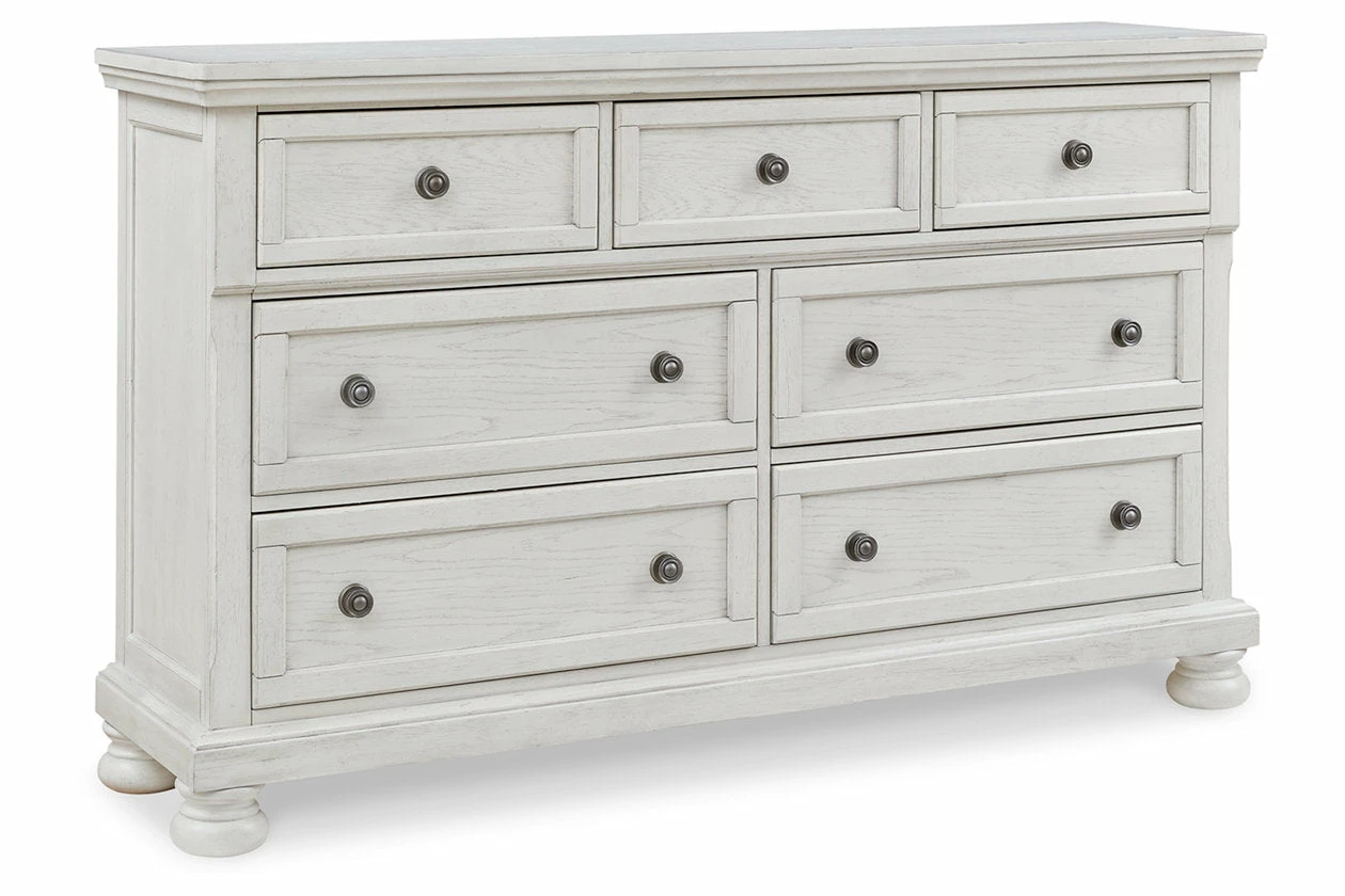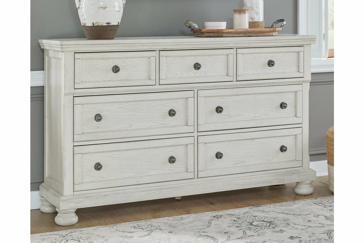Elegant, timeless furnishings take your bedroom to the next level. Nothing does that better than this dresser. The antiqued white finish with a wonderful grain texture radiates sophistication, while dark bronze-tone knobs add an ornate touch. Felt finishing in the upper drawers rounds out this tasteful piece.