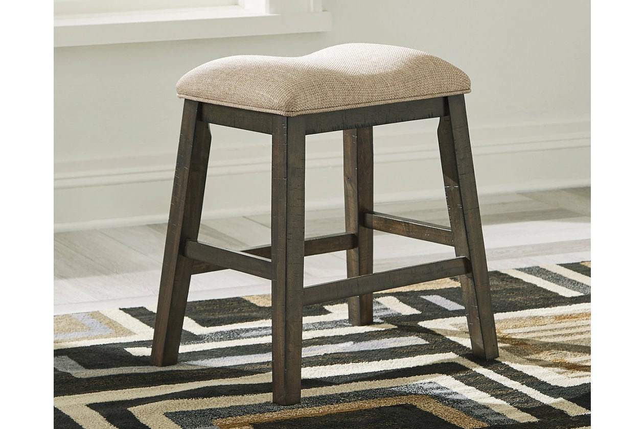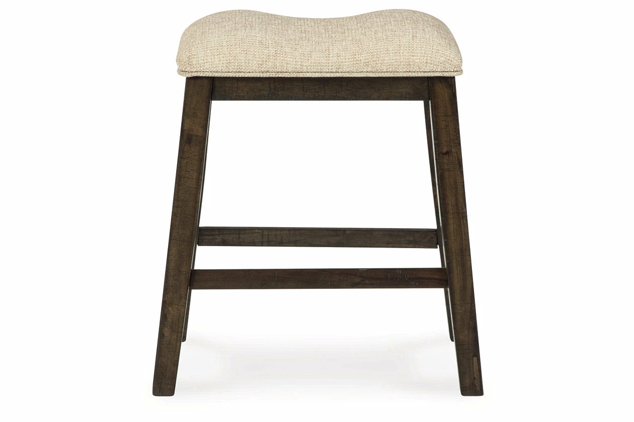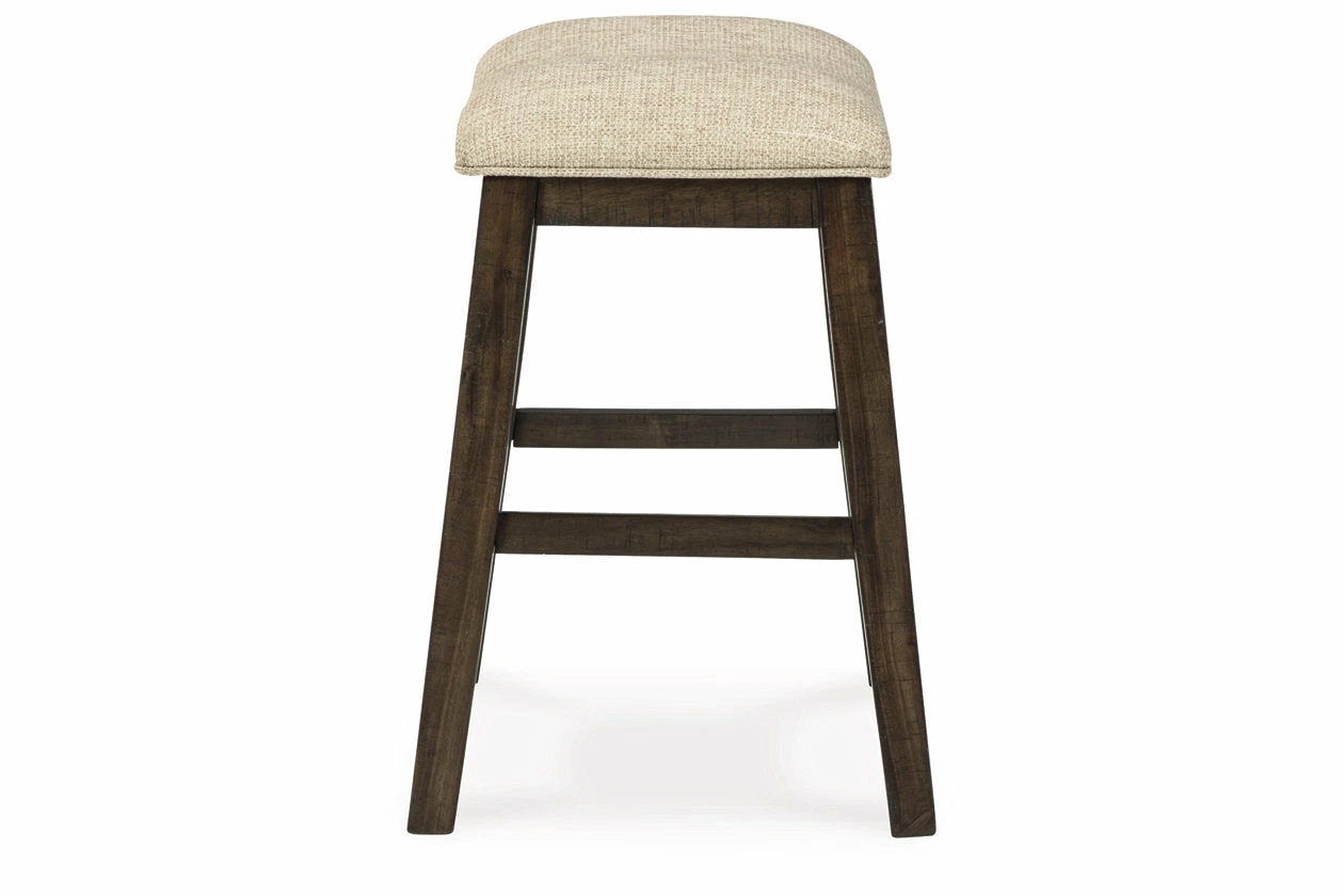 Love a modern farmhouse sensibility? Saddle up with this upholstered stool. Its sturdy wood frame with rough sawn texture is topped with a sumptuous saddle seat covered in a light brown textured fabric for a relaxed look and feel.
