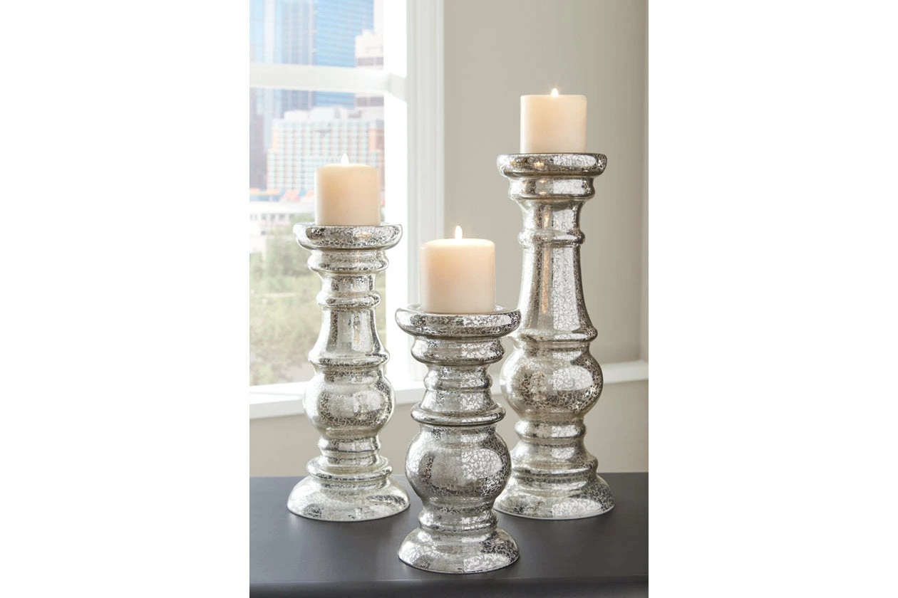 The turned silhouettes of this 3-piece candle holder set create gorgeous negative anywhere in your home. Silvertone finished mercury glass elevates the look with a hint of shine. With candles lit, an enticing aroma fills the air to complement your contemporary style.