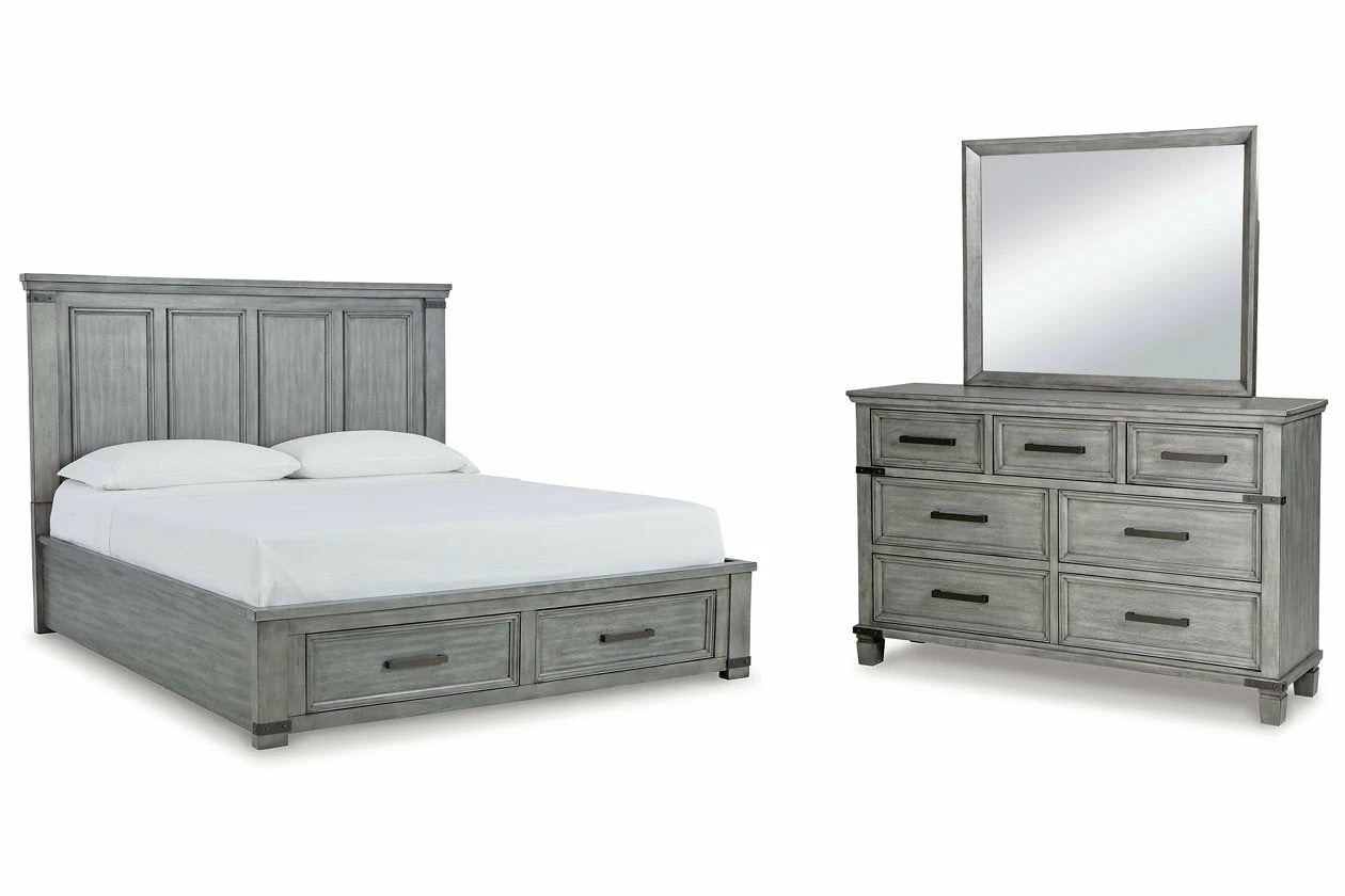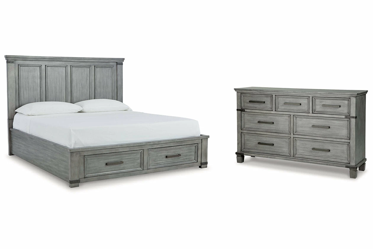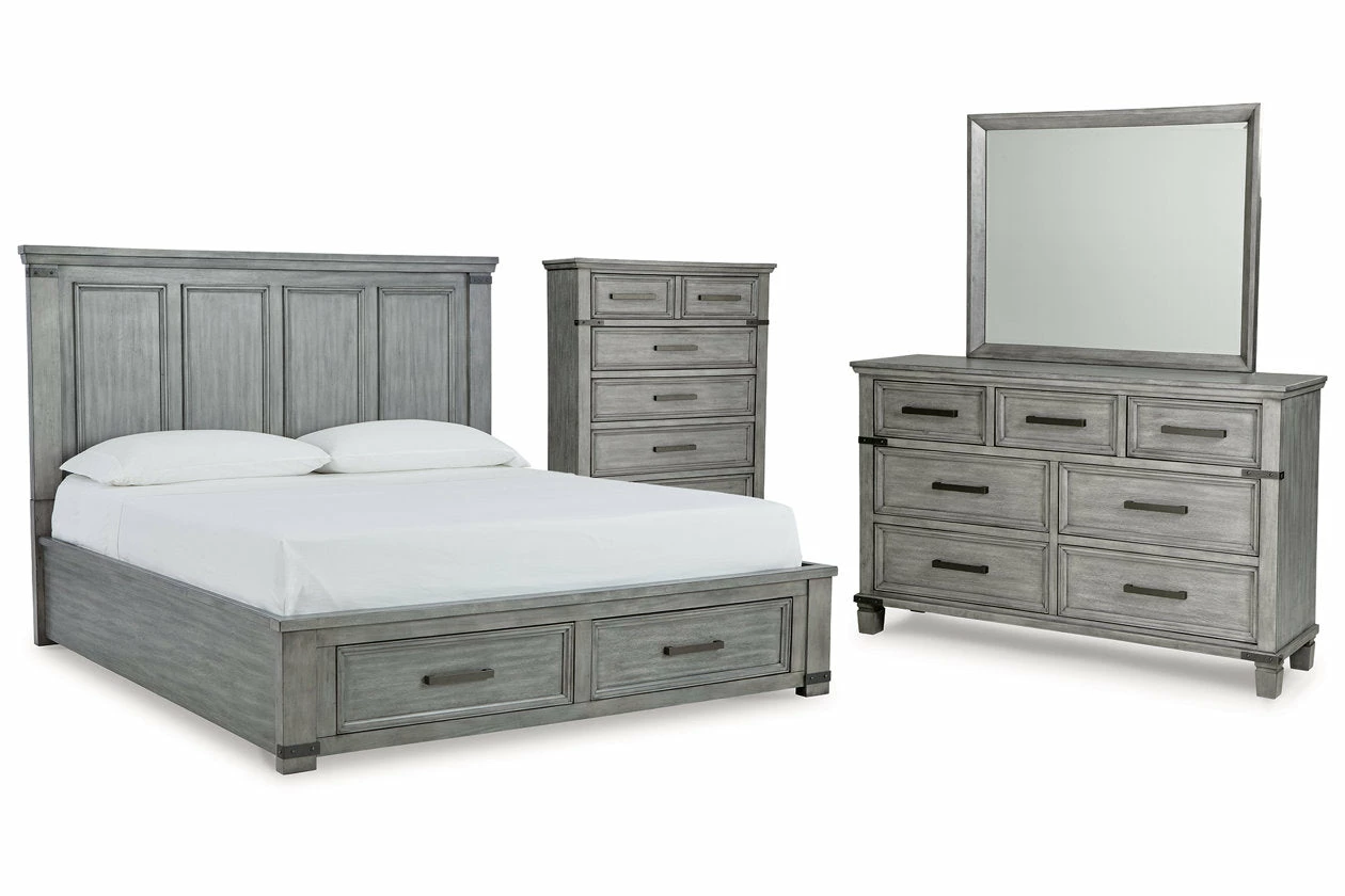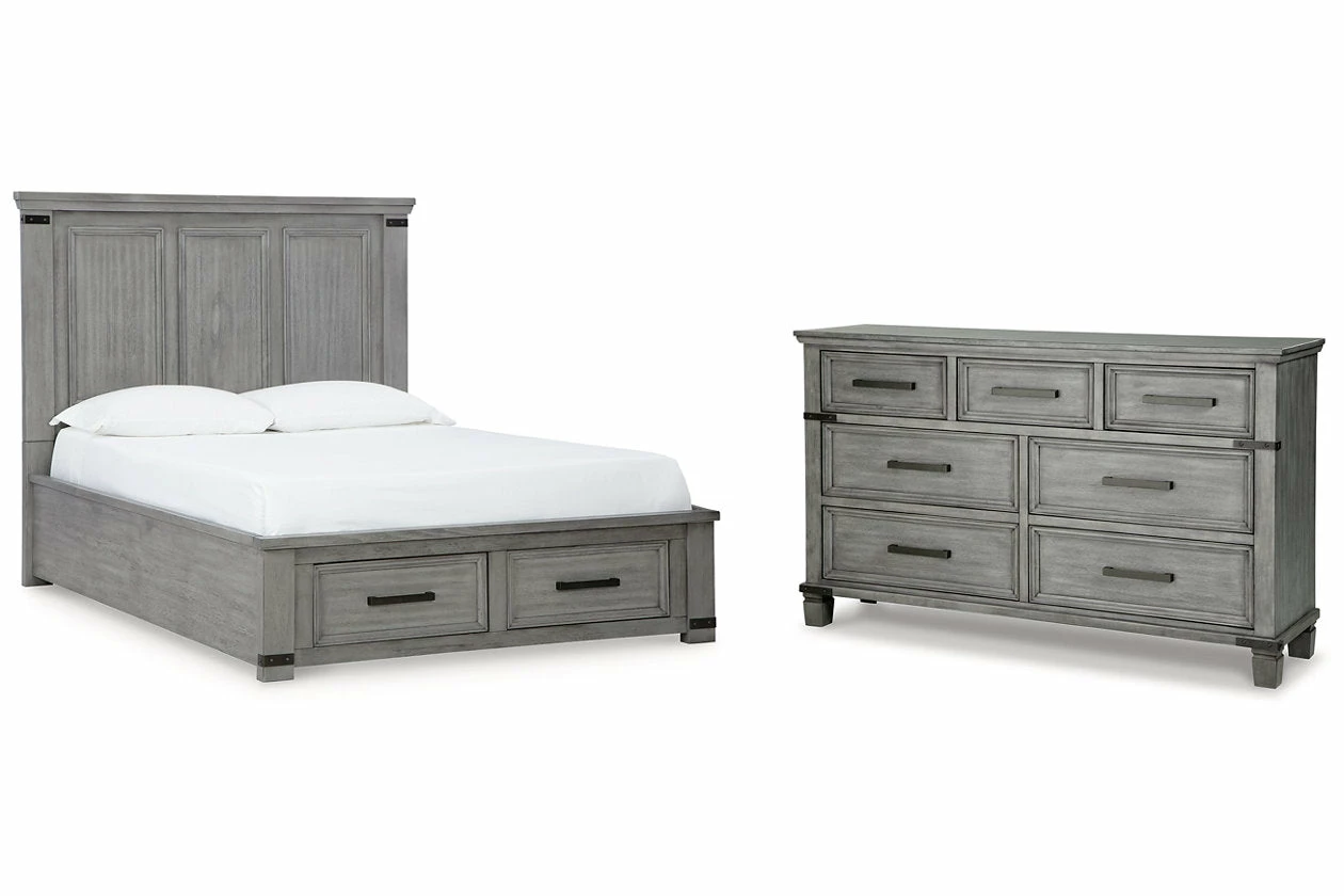 What’s old is what’s new with this bedroom package. Serving up a fresh look in urban farmhouse style, this set features a light weathered gray finish with dark aged bronze-tone bar pulls and metal straps for a casually cool sensibility. Profiled frames and thick-profiled top moulding are the earmarks of timeless design.