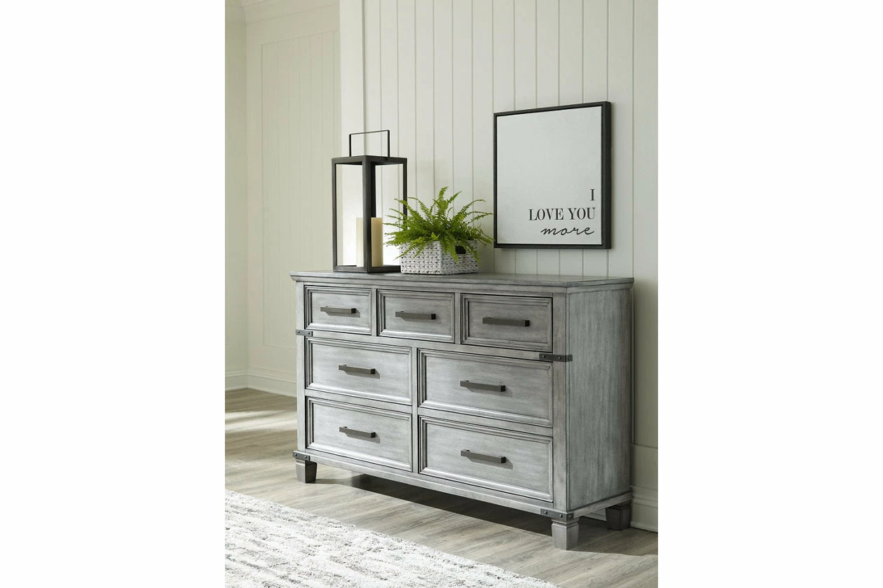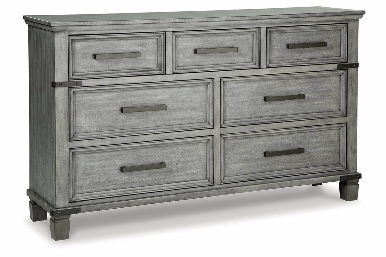 What’s old is what’s new with this dresser. Serving up a fresh look in urban farmhouse style, this eclectic piece features a light weathered gray finish with dark aged bronze-tone accents and metal straps for a casually cool sensibility. Profiled drawer frames, thick-profiled top moulding and tapered legs are the earmarks of timeless design.