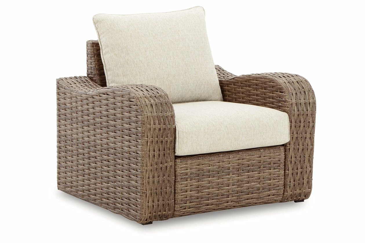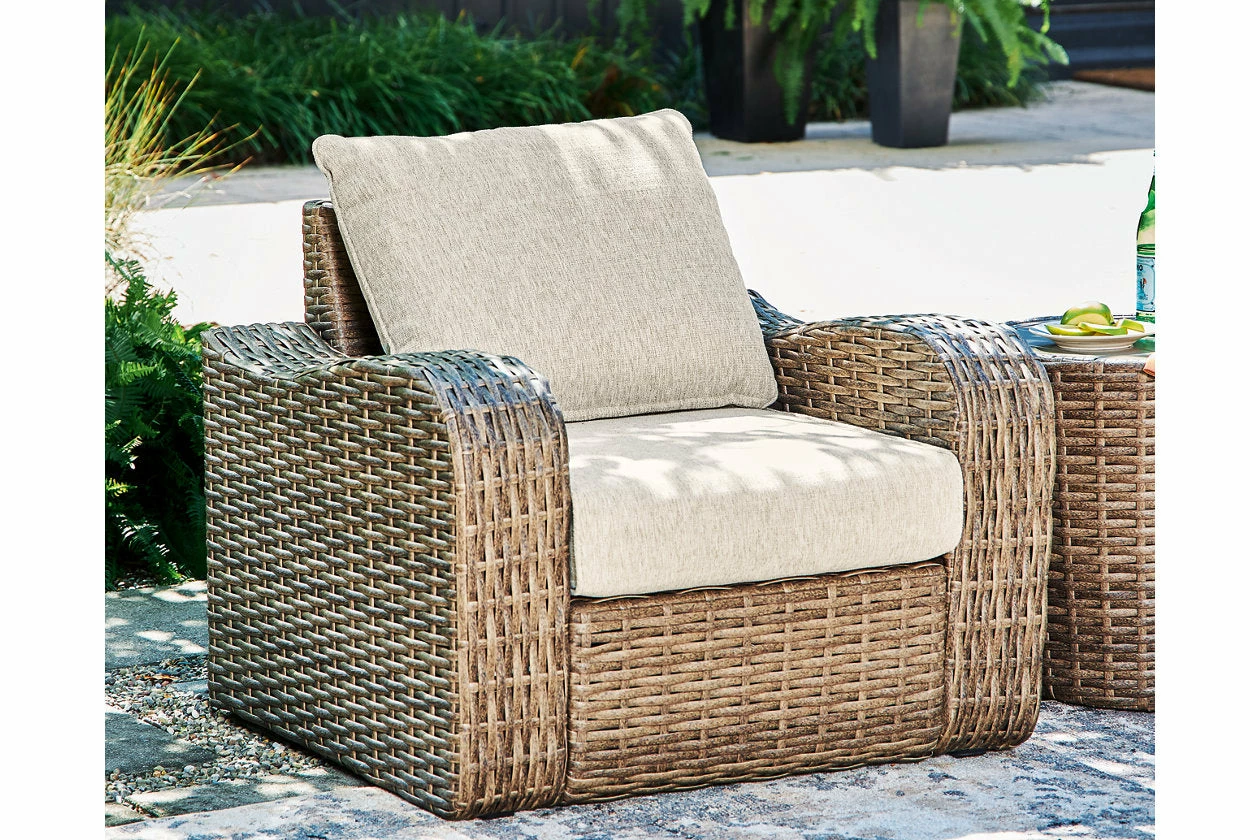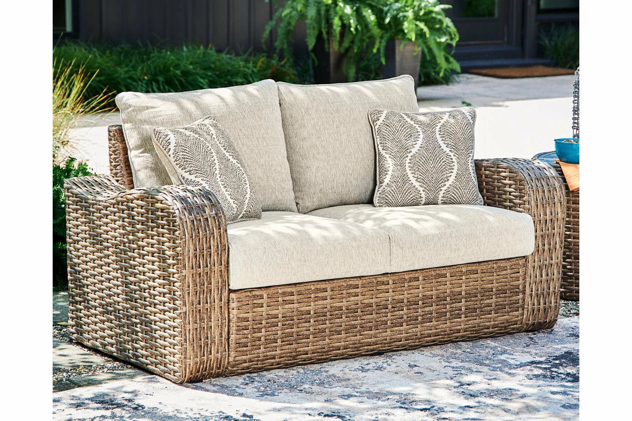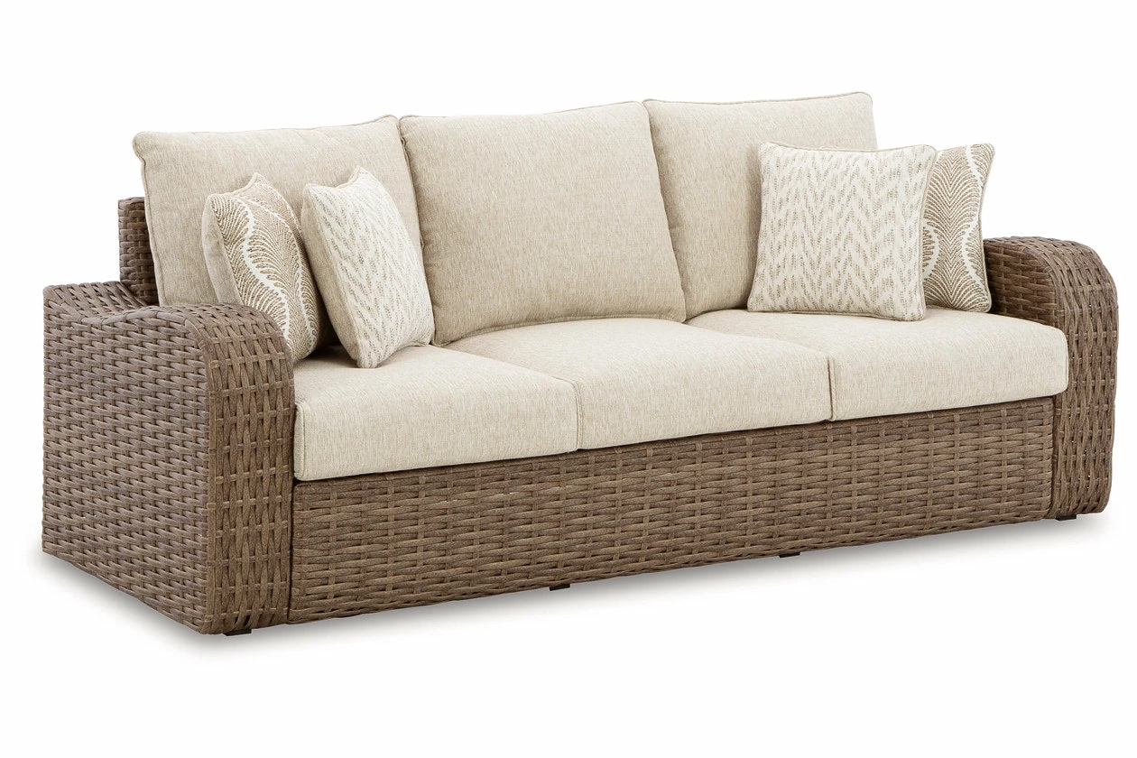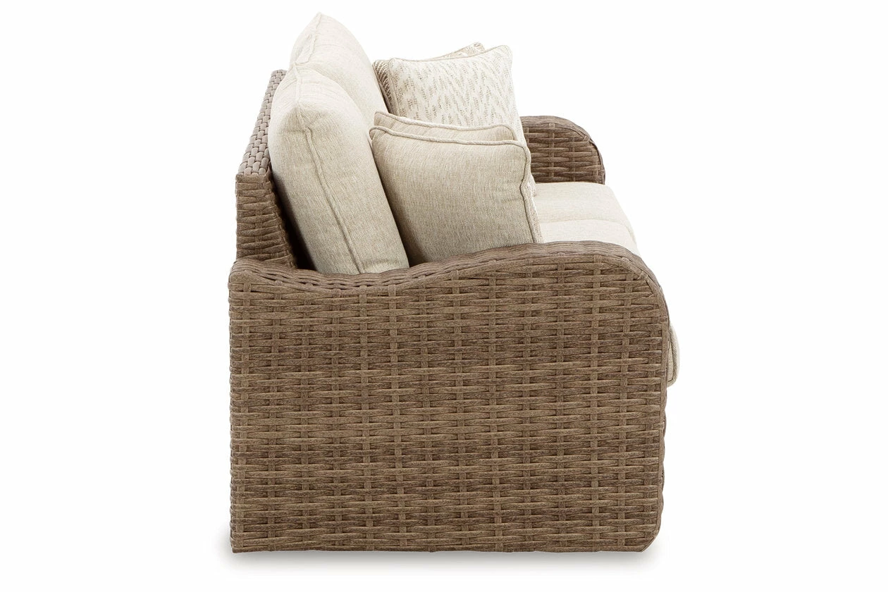 Indulge in style that suits your easy-breezy sensibilities. This sofa crafts a richly relaxed feel in your outdoor seating area. The driftwood hue of its durable resin wicker invites your casually cool aesthetic alfresco, with plush cushions wrapped in high-performance Nuvella+â„¢ fabric providing ultimate comfort.
