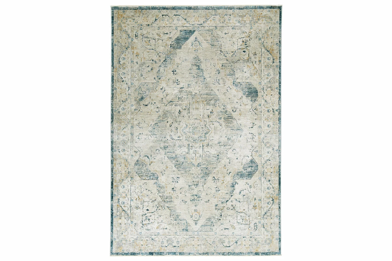 The traditional ornamental motif of this faux faded medallion rug melds timeless vintage design with modern style. Boasting subdued hues of gold, blue, beige and gray, the low-pile rug adds a touch of exquisite artistry to any room in your living space.