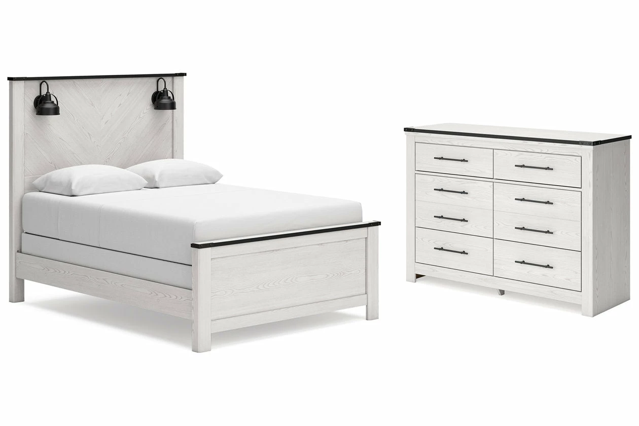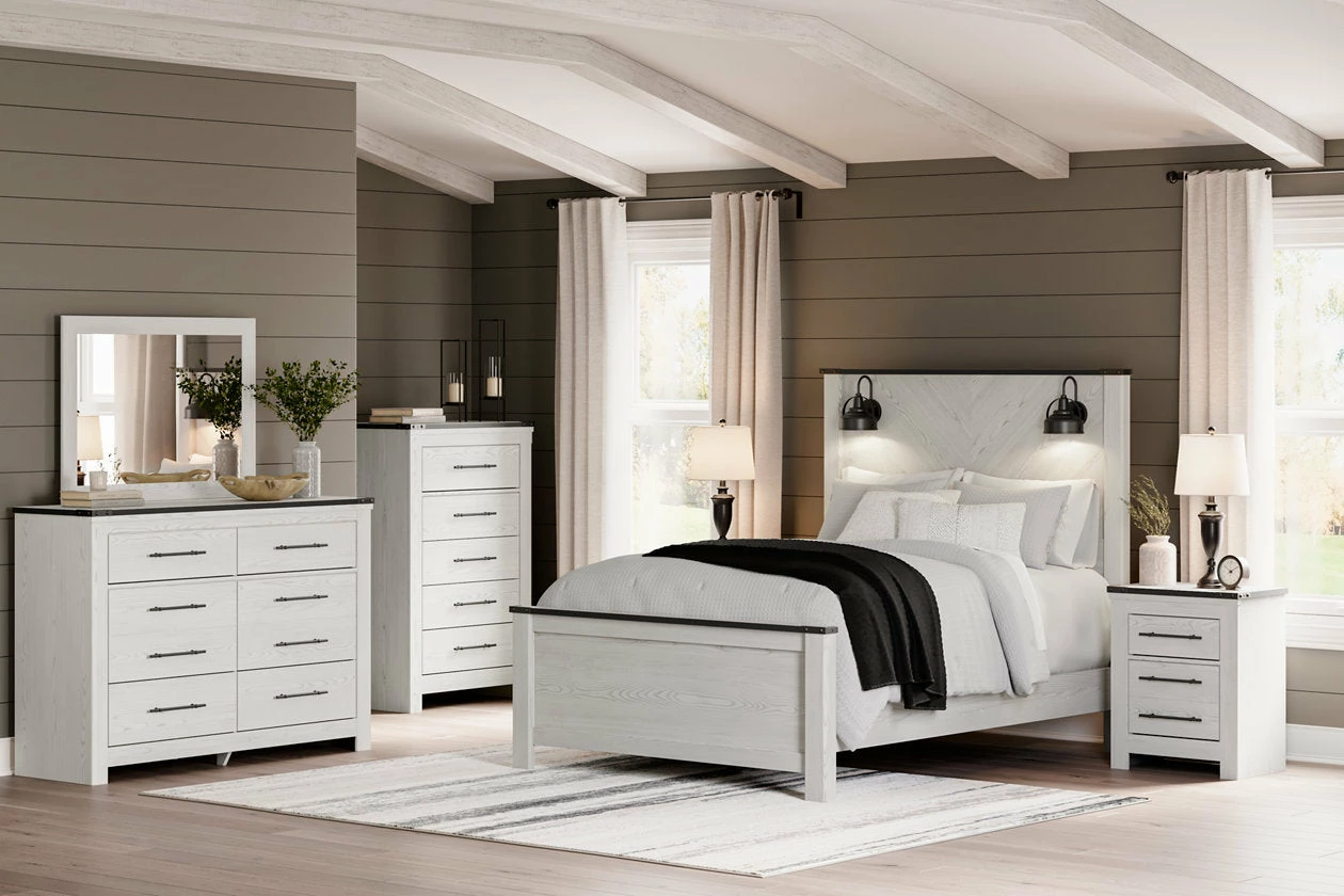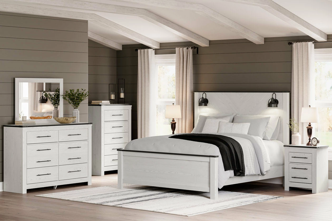 This bedroom package harmonizes effortlessly with your farmhouse-chic approach to contemporary style. Curate your space with the charmingly classic look of its white rustic finish. Faux metal banding and nailhead corner accents infuse the clean-lined set with delightful vintage character.