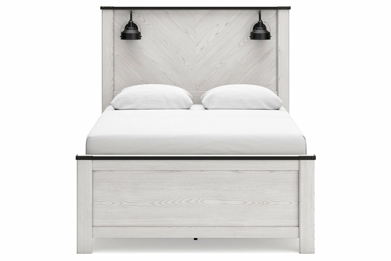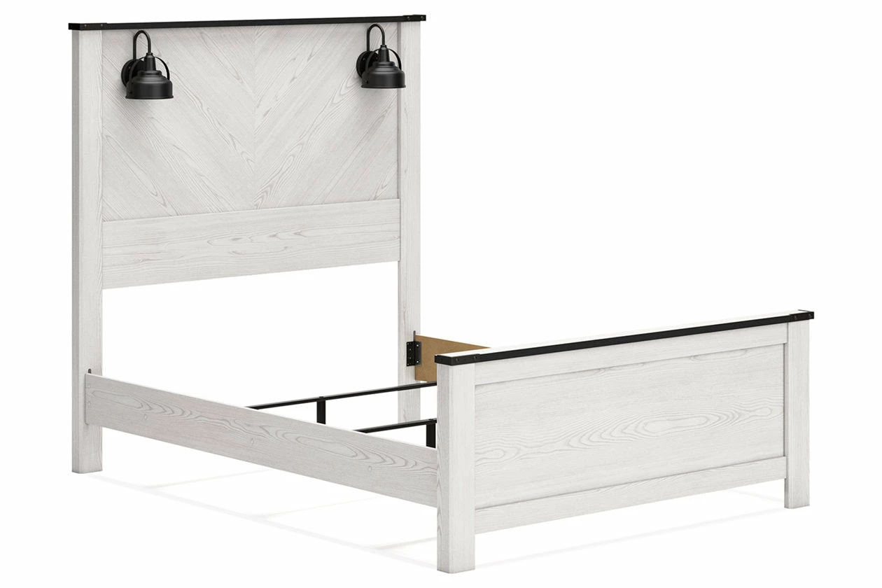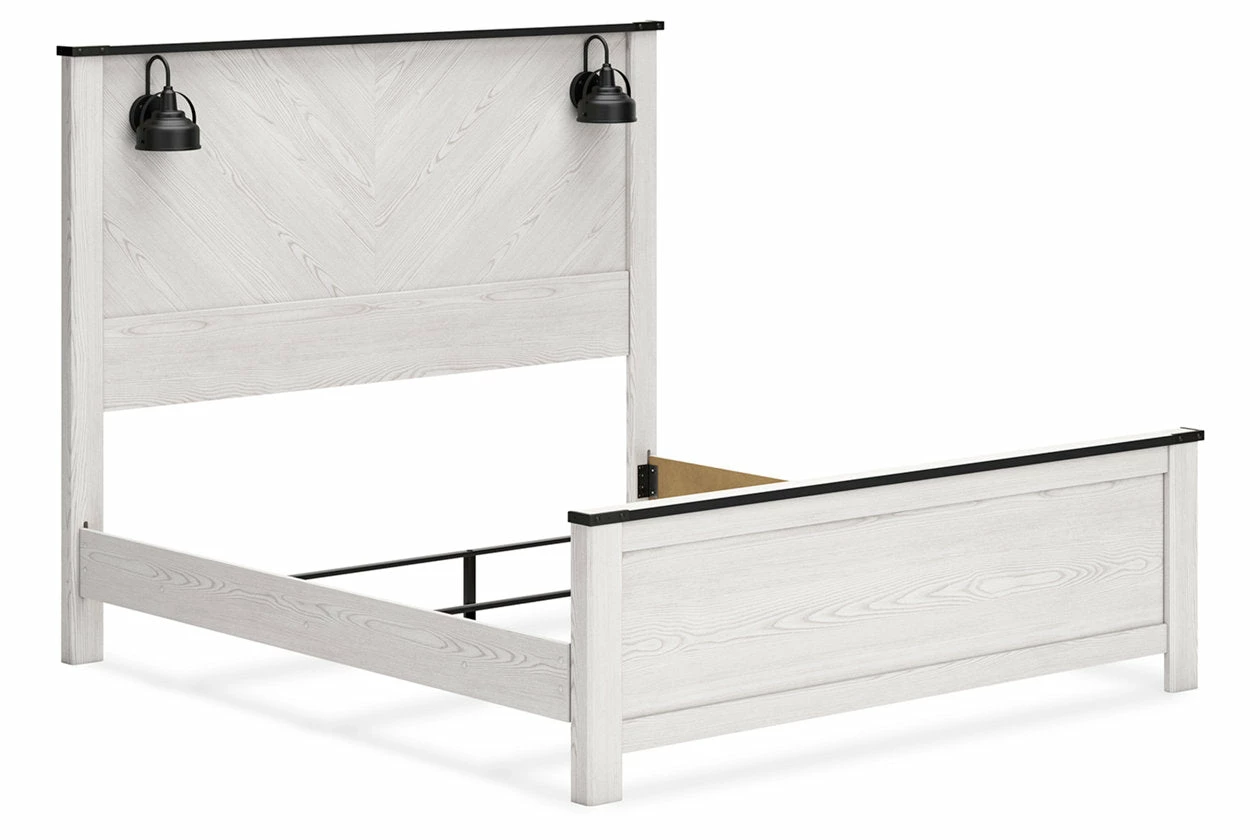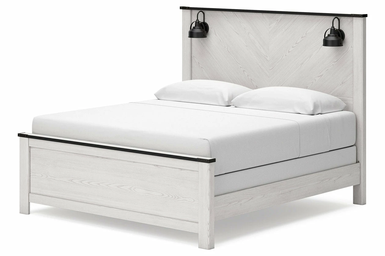 This king panel bed harmonizes effortlessly with your farmhouse-chic approach to contemporary style. Curate your space with the charmingly classic look of its white rustic finish. Faux metal banding with nailhead corner accents infuses the clean-lined design with delightful vintage character. Polishing off the piece, matte black sconce lights merge simply stunning form and function.