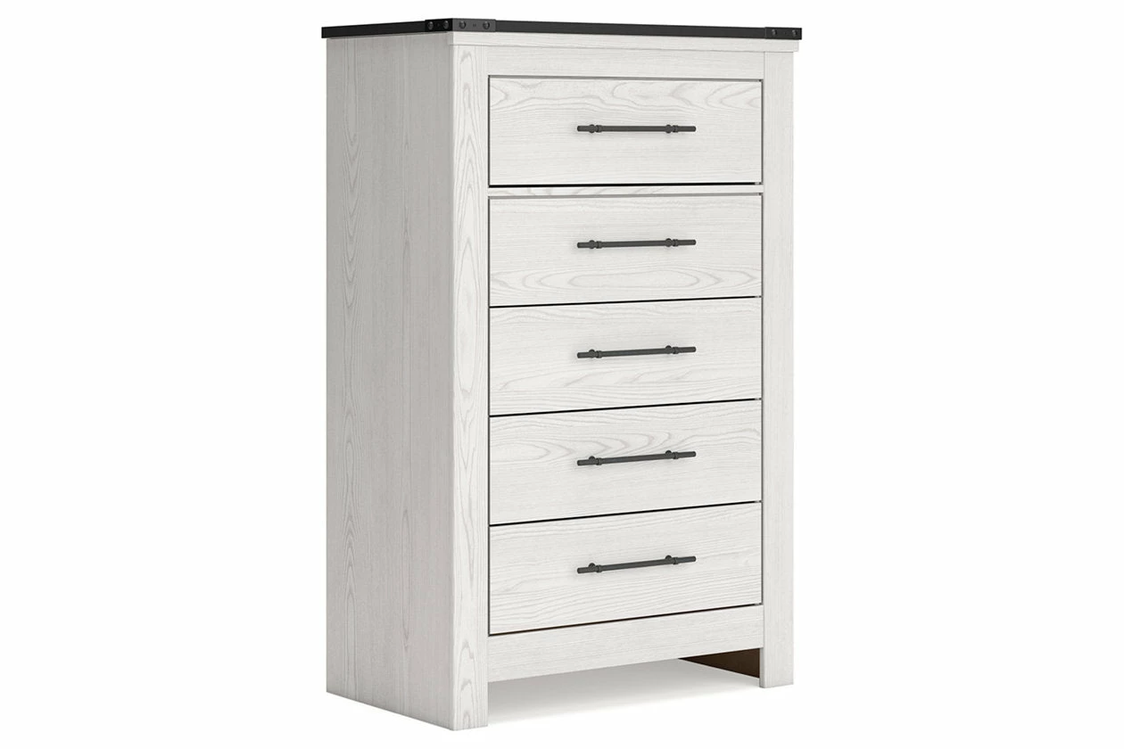 This chest of drawers harmonizes effortlessly with your farmhouse-chic approach to contemporary style. Curate your space with the charmingly classic look of its white rustic finish, with sleek dark pewter-tone handles adding a modern touch. Faux metal banding and nailhead corner accents infuse the clean-lined design with delightful vintage character.