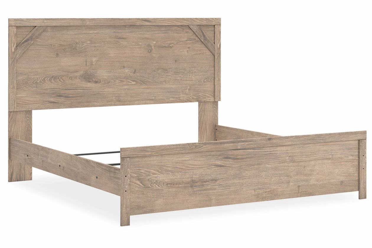 Cool, clean and casually modern. This king panel bed’s light natural finish sets the tone for your calming sanctuary. Matte black sconce lights and an abstract design on the headboard bring a fresh look to the bed’s simply stunning profile.