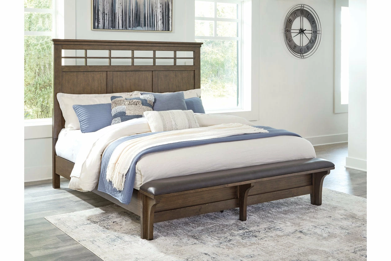 This king panel bed is well-suited to everyday living with its expertly balanced approach to style and function. Take the stress out of decorating—a classic medium brown finish easily pairs with existing furniture pieces. Its timeless design stays in style as you update your space, while open detailing at the top of the headboard is a trendy touch. And its cushioned footboard bench provides seating for morning get-ready routines or late night chats. All that’s left for you to do is to effortlessly enjoy the day-to-day comforts of home.