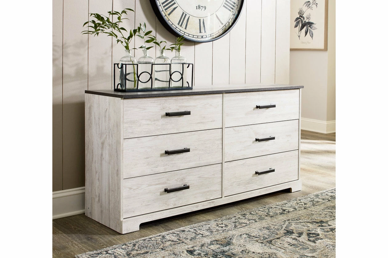 Give provincial a new meaning with the chic look of this dresser. A two-tone finish keeps this piece light and fresh, while the warm pewter-tone hardware adds an industrial touch. The dresser’s distressed whitewashed body adds a delightfully homespun charm to your space.