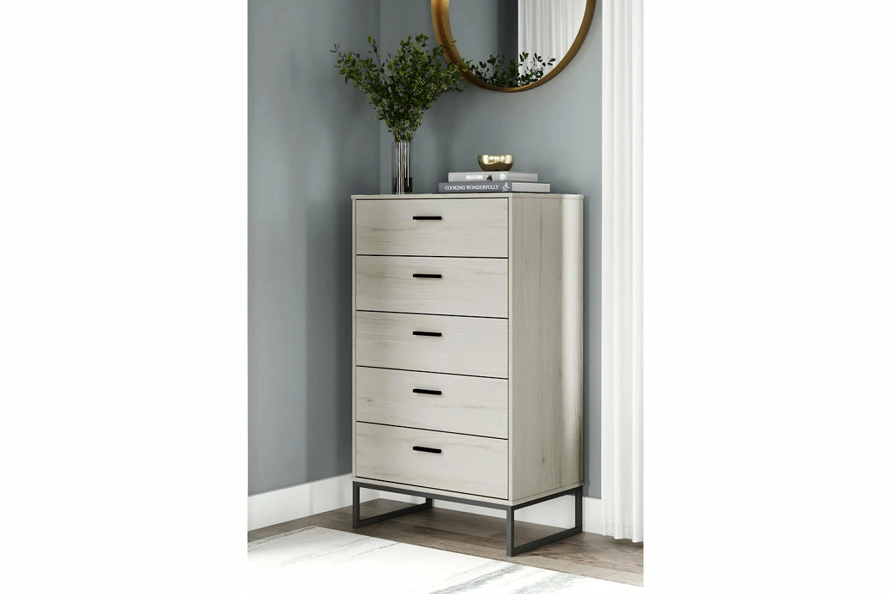Light and bright, this chest of drawers is inspired by chic design. A light natural finish over replicated oak grain offers an authentic touch to this so-cool piece. It beautifully blends the hues of natural living with the edginess of your modern lifestyle.