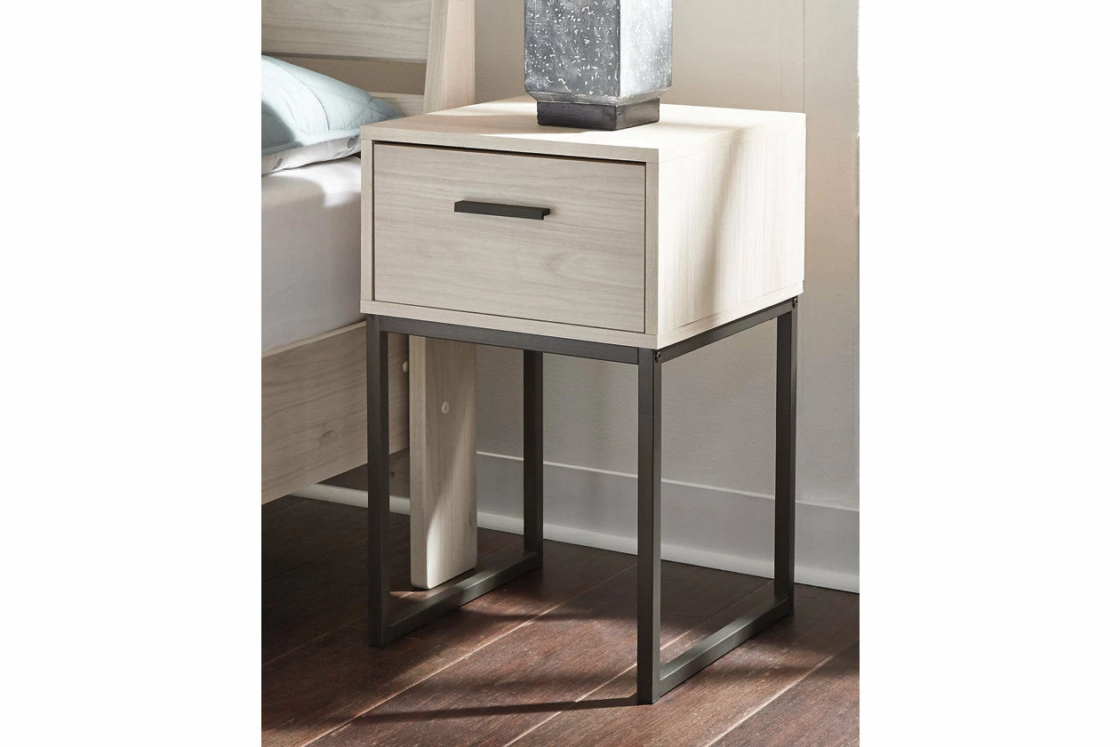 Light and bright, this nightstand is inspired by chic design. A light natural finish over replicated oak grain offers an authentic touch to this so-cool piece. Beautifully blend the hues of natural living with the edginess of your modern lifestyle.