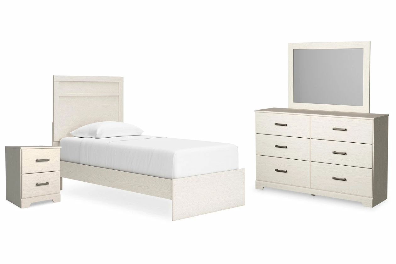 With its clean-lined look and modern attitude, this bedroom package is a fresh style awakening. A crisp, white hue over subtle replicated wood grain easily complements your existing aesthetic. Smooth drawer fronts with antiqued pewter-tone handles complete the look—proof that beauty lies in the details.