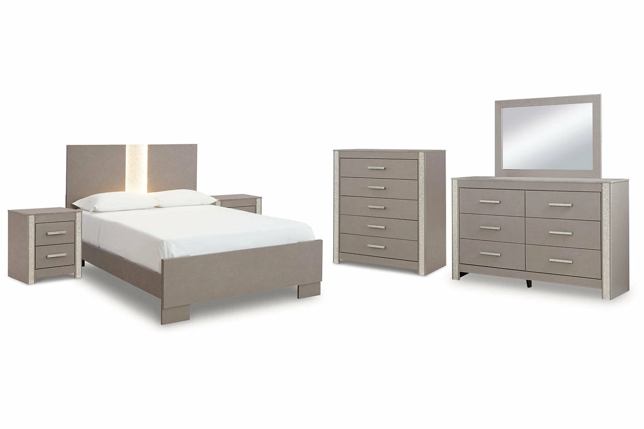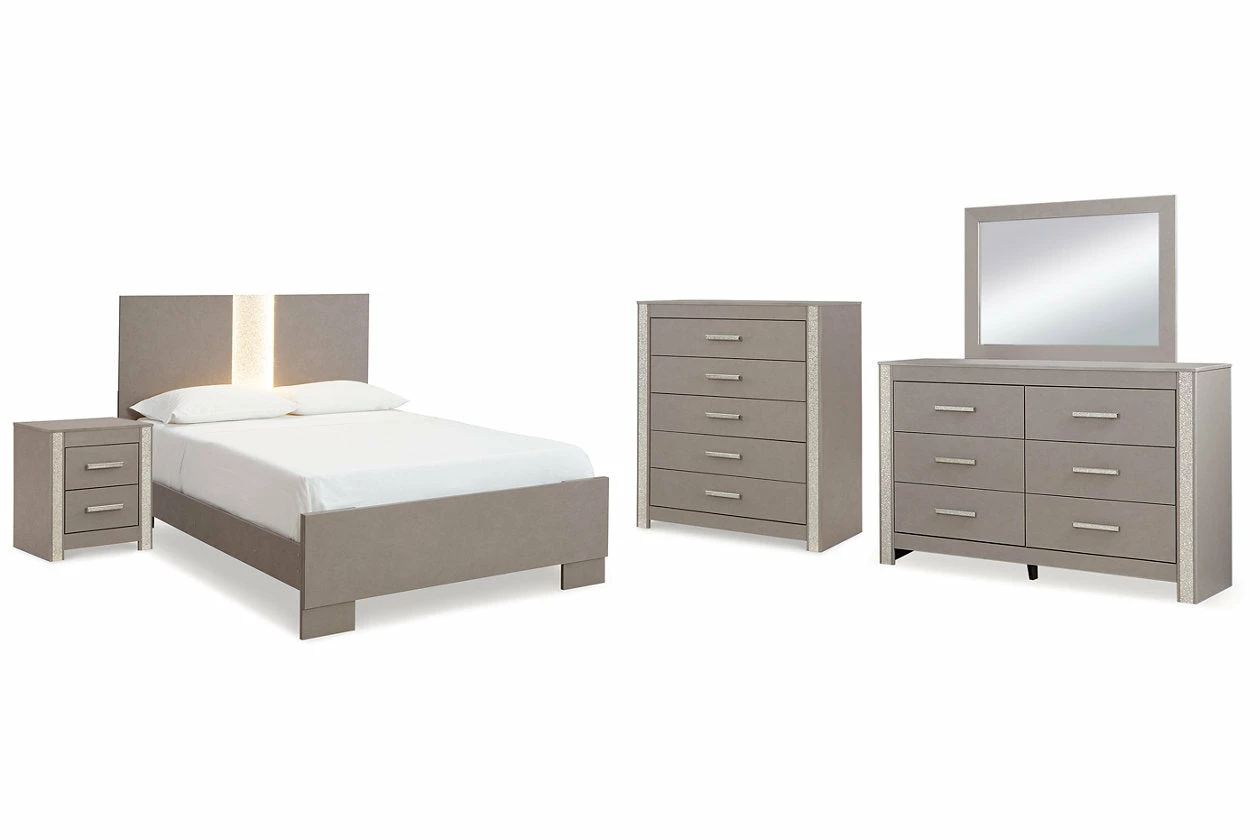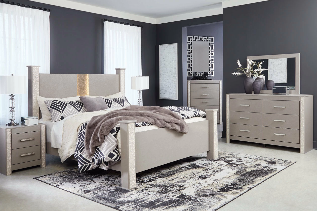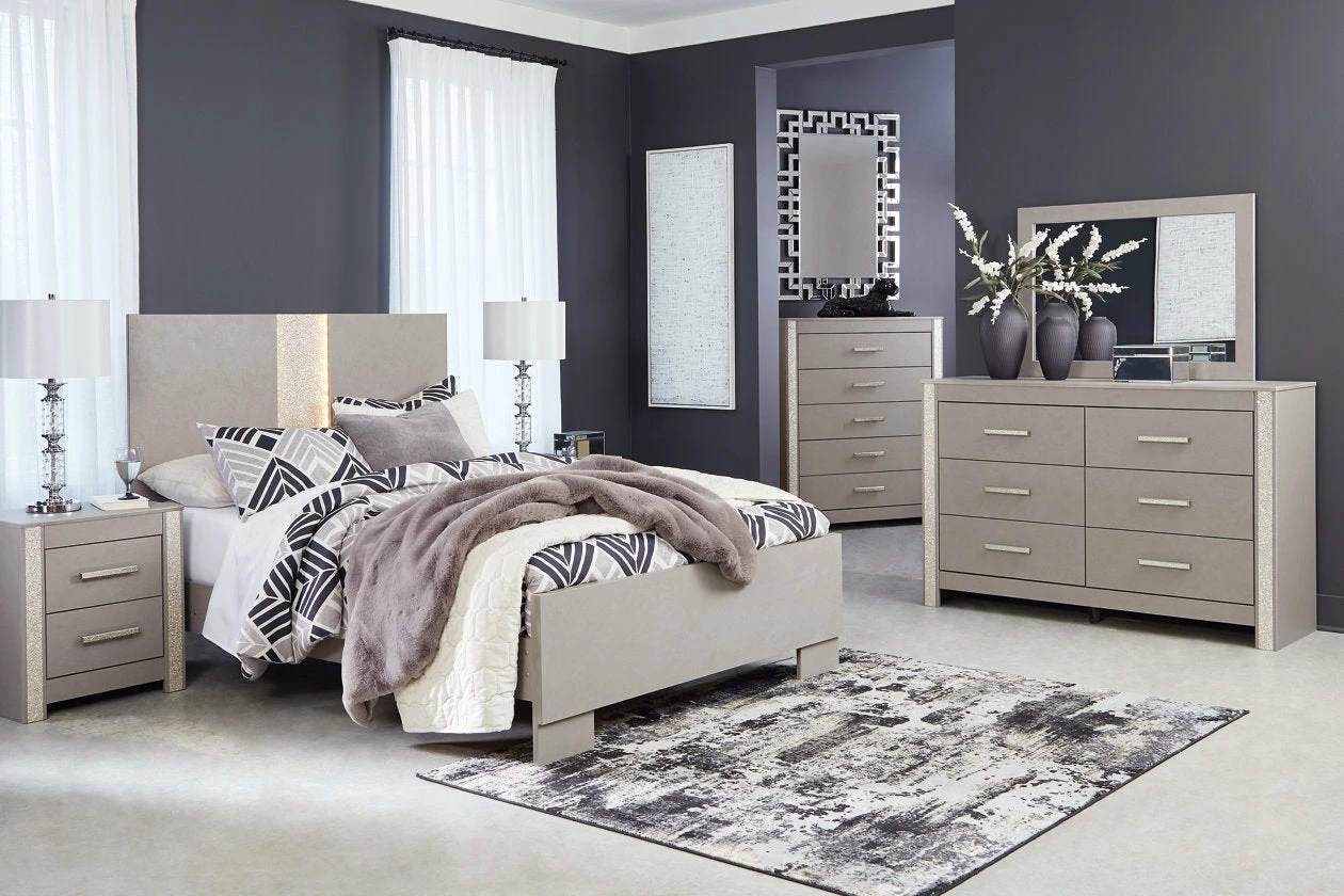 Love sleek and bold contemporary style? Drink in the beauty of this bedroom package. Its eye-catching details include glam glitter accents and the look of leather grain with a subtle gray finish. Combined with the streamlined aesthetic, this set is a simply stunning way to achieve the bedroom of your dreams.