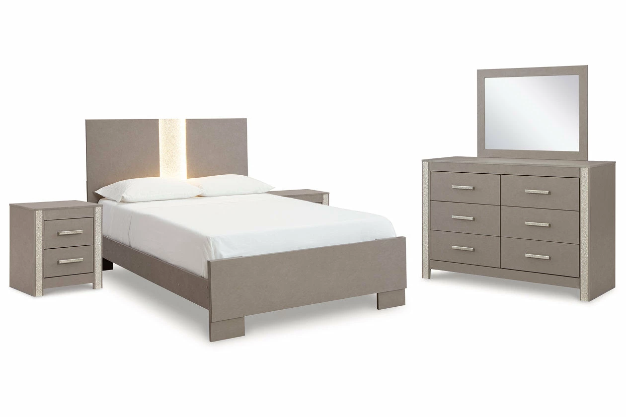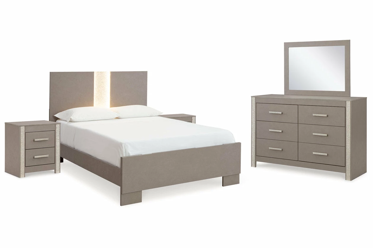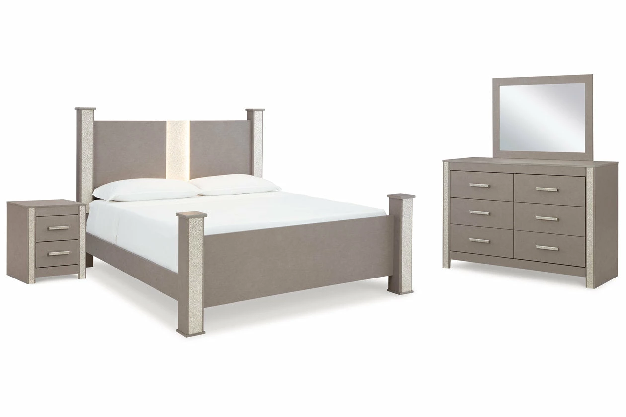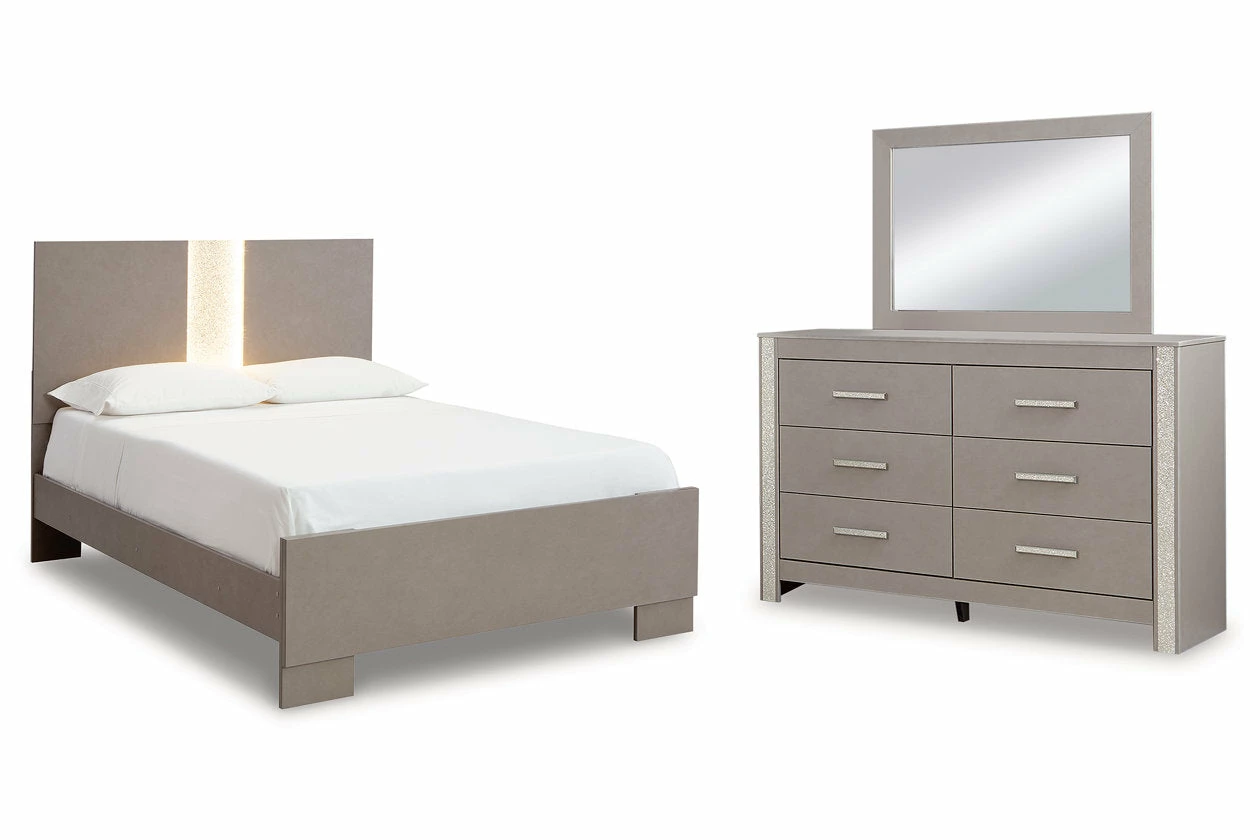 Love sleek and bold contemporary style? Drink in the beauty of this bedroom package. Its eye-catching details include glam glitter accents and the look of leather grain with a subtle gray finish. Combined with the streamlined aesthetic, this set is a simply stunning way to achieve the bedroom of your dreams.