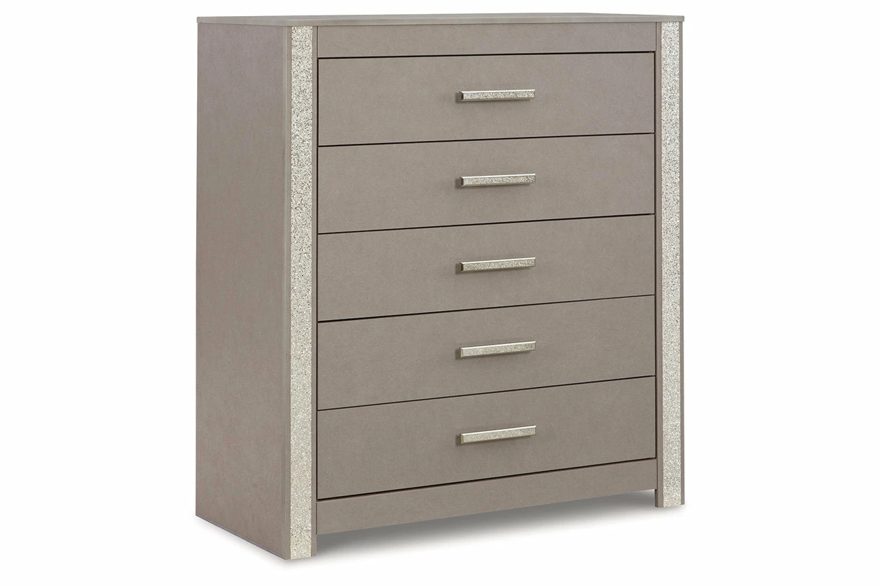 Love sleek and bold contemporary style? Drink in the beauty of this chest of drawers. Its eye-catching details include glam glitter accents and the look of leather grain with a subtle gray finish. Large-scale linear handles, in a sophisticated champagne chrome tone, play perfectly with the streamlined aesthetic. This storage piece is a simply stunning way to achieve the bedroom of your dreams.