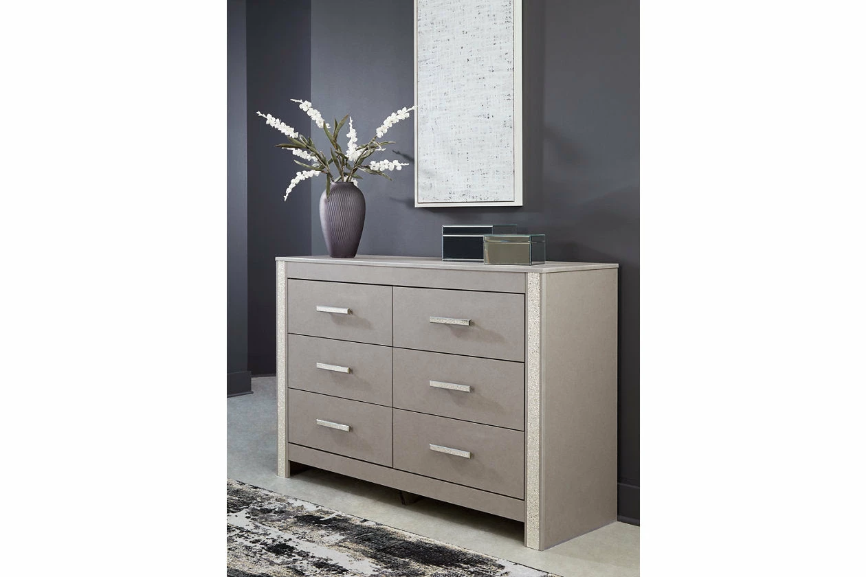 Love sleek and bold contemporary style? Drink in the beauty of this dresser. Its eye-catching details include glam glitter accents and the look of leather grain with a subtle gray finish. Large-scale linear handles, in a sophisticated champagne chrome tone, play perfectly with the streamlined aesthetic. This storage piece is a simply stunning way to achieve the bedroom of your dreams.