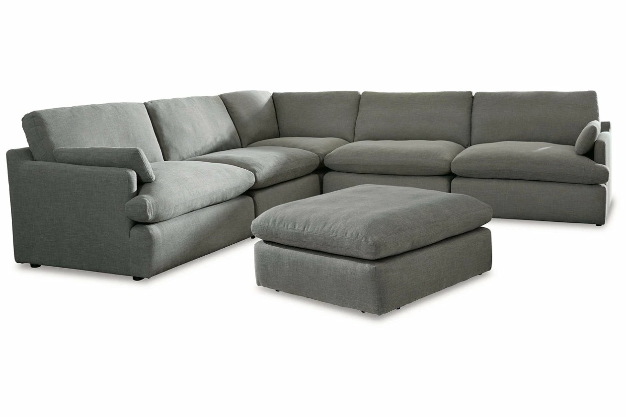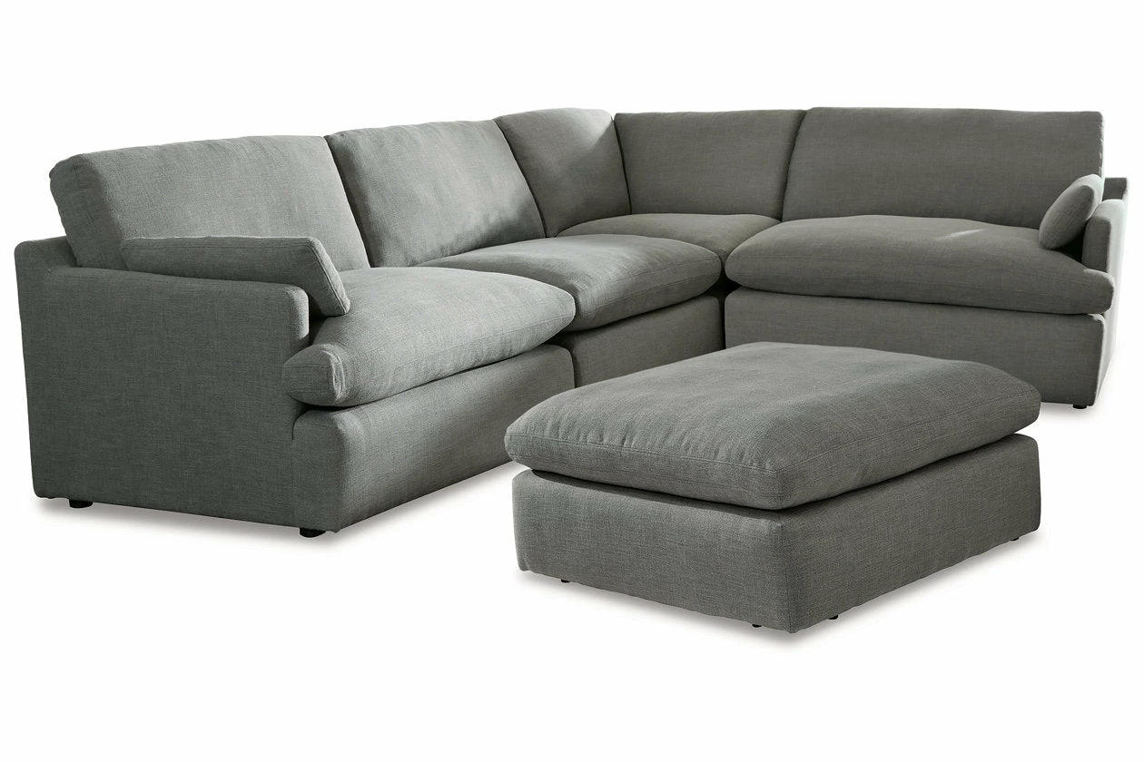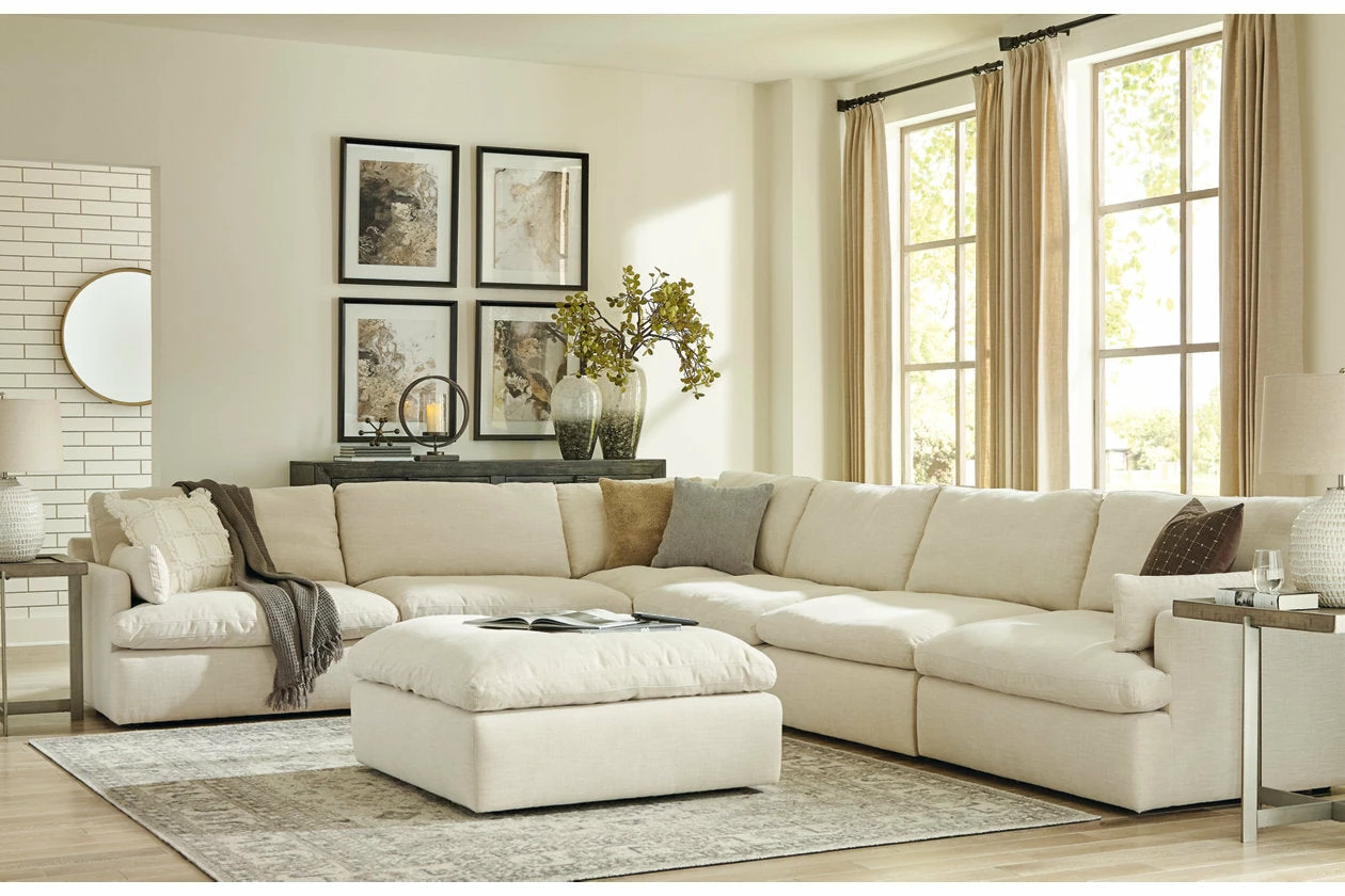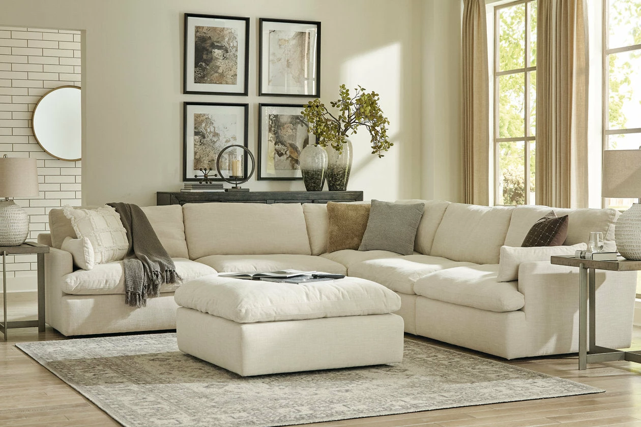 Blending a fresh, clean aesthetic with ultra-soft comfort that’s impossible to resist, this sectional and ottoman package sets the scene for living the dream. Whether your look is warm and cozy modern farmhouse or cool, crisp and contemporary, this masterfully crafted modular set tantalizes with plush feather-fiber blend reversible cushions and a linen-like fabric that’s a breath of fresh air. Slim track arms and structural bolster pillows enhance the experience.