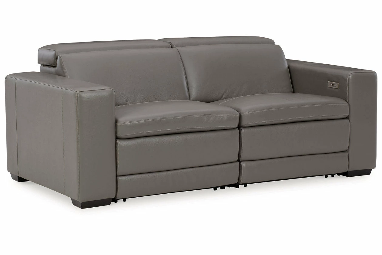 Truly putting high design into recline, this loveseat with gray leather match upholstery proves that just because you’re a recliner doesn’t mean you have to look like one. Deceptively beautiful, its ultra clean-lined aesthetic is as cool and contemporary as they come. The low-profile back has a super swank look. When you need more support for your head and neck, the press of a button engages the Easy Viewâ„¢ power adjustable headrest, designed to let you lean back and still have a primo view of the TV. To save space, the zero wall design requires minimal space between wall and chair back. Indulgent pillow top seating gives an added layer of comfort.