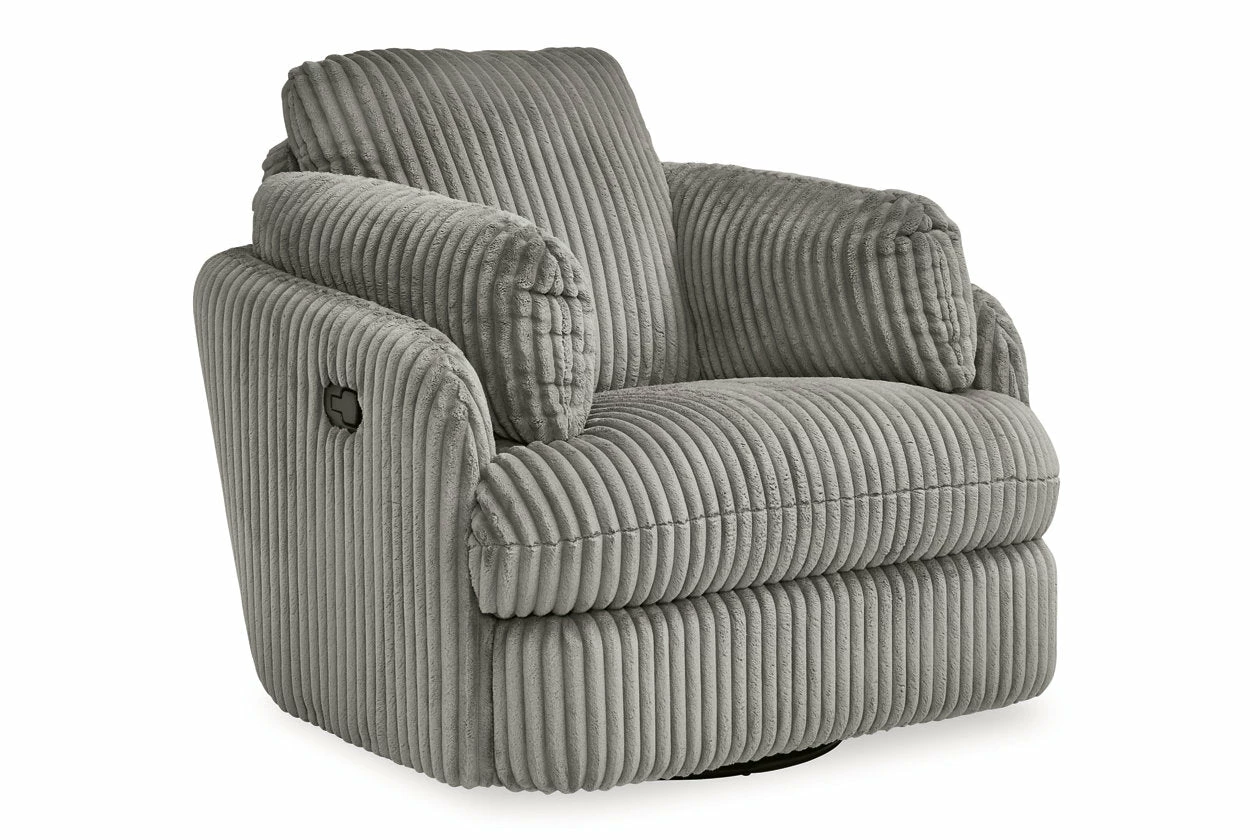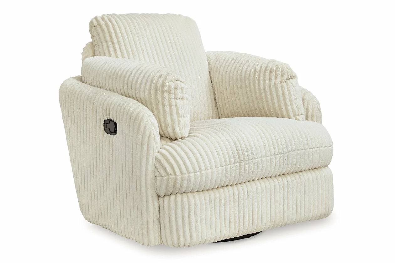 Like a warm hug, this recliner envelops you in comfort with its barrel shape and soft cord upholstery. It reclines, glides, and swivels to cater to your every need. This chair also features posh bolster pillows and cleverly designed storage. Unwind and cuddle up in your new cozy place.
