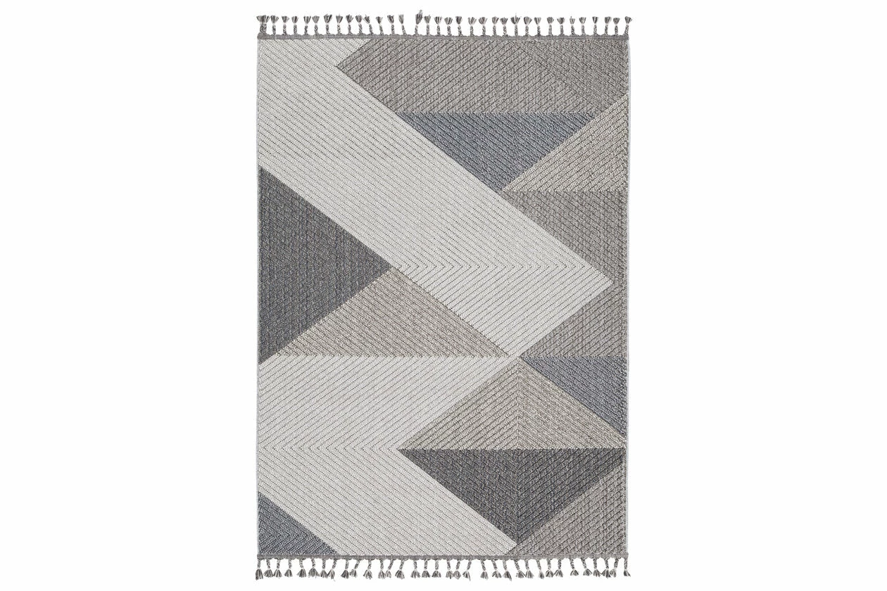 This area rug features a unique appearance with a distinctive geometric design in cream, gray, taupe and blue, with a braided tassel edge for added appeal. This beautiful rug infuses a modern sensibility that simply suits your style.