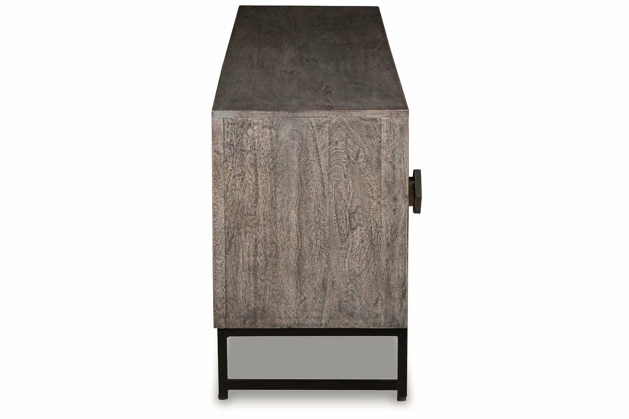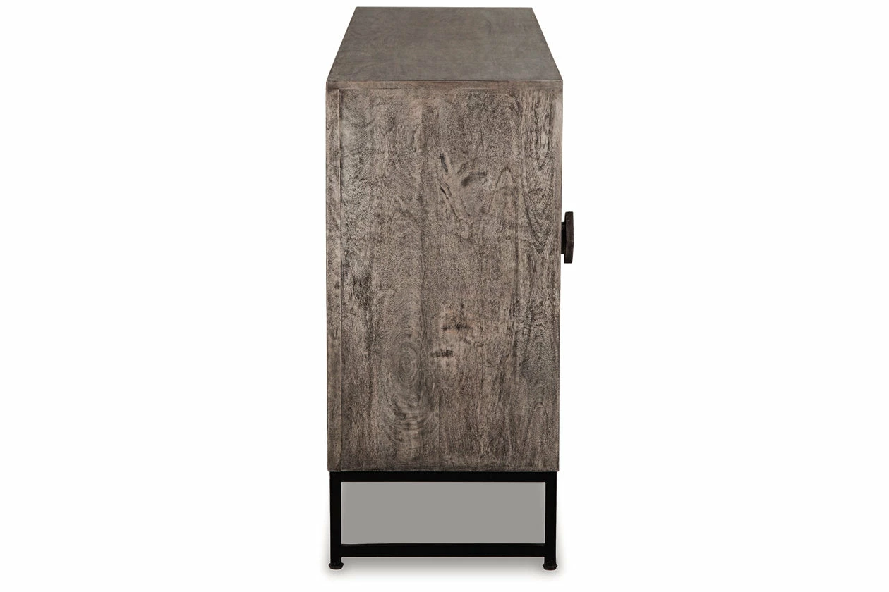 For admirers of understated vintage glamour, this accent cabinet beautifully complements your desired aesthetic. The classic charm of a distressed gray finish meets chic metropolitan styling, with art deco-inspired door fronts and an industrial black metal base. A balanced blend of contemporary and casual design, this piece is the personification of laid-back luxury.