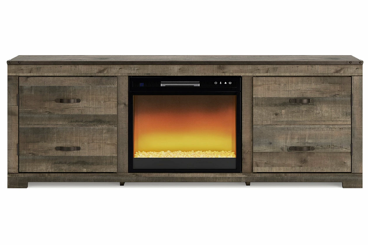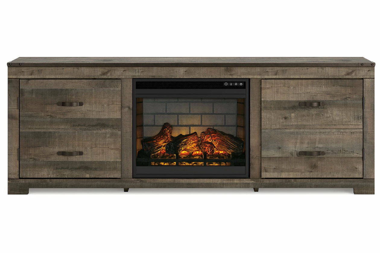 Entertain a rugged yet refined sense of style with this large TV stand with fireplace insert. Warm finish and plank-style details pay homage to reclaimed barn wood, while metal banding with nailhead accents infuses a touch of industrial cool. Ultraclean lines ensure a look that can go from the country to the city and feel equally at home. What really turns up the heat: an electric infrared fireplace insert with faux firebrick surround that operates with or without infrared heat and includes a multi flame feature, 7-level temperature setting, five brightness levels and LED glowing embers effect.