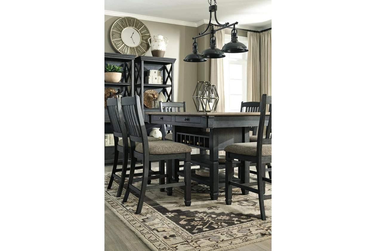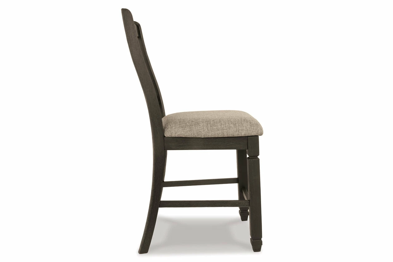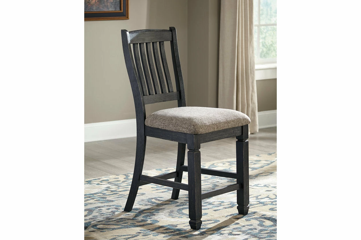 Invite your family into the heart of your home with this upholstered bar stool. Framed back and tapered legs are a sturdy foundation. Black finish is beautifully textured. Heavily woven fabric has a quality feel-good touch. Silvertone nailhead trim is decorative without all the fuss. This is trend-right urban farmhouse style.