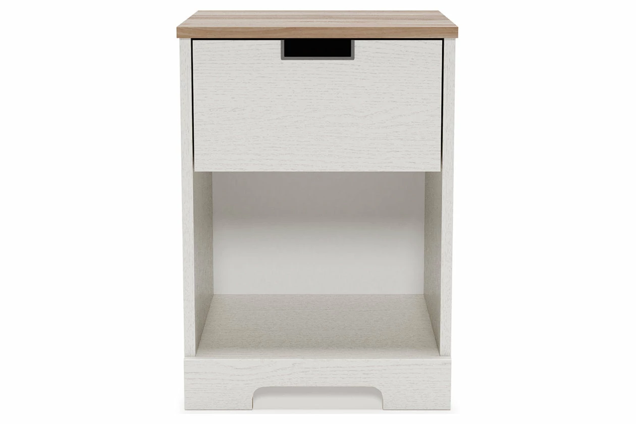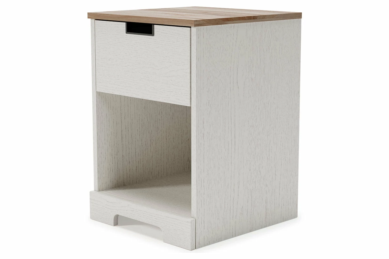 Fresh and inviting, this nightstand is truly versatile. A crisp white painted finish brings light to your room, while a warm brown finish accents the top. The nightstand’s open cubby offers additional beside storage. A smooth-gliding drawer with vinyl-wrapped sides and back for durability makes this piece a lively addition that will brighten your space in a snap.
