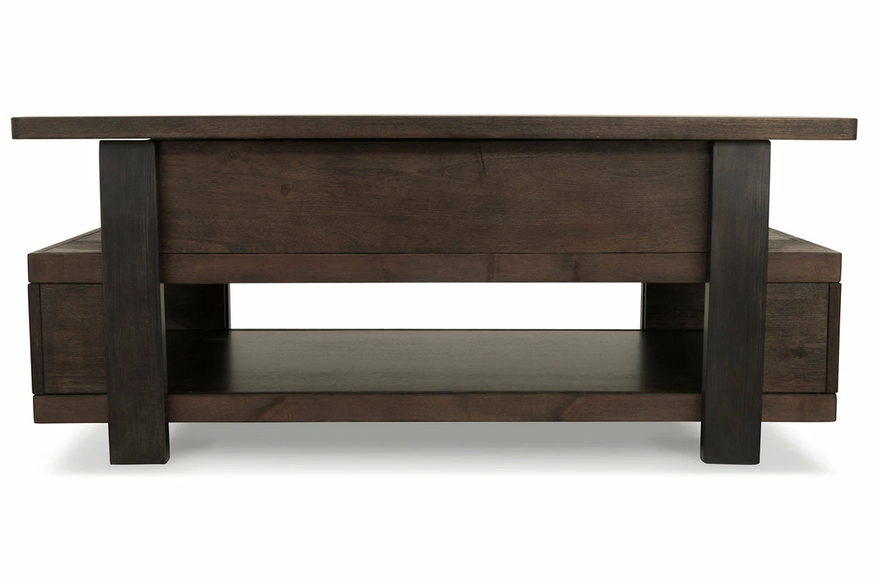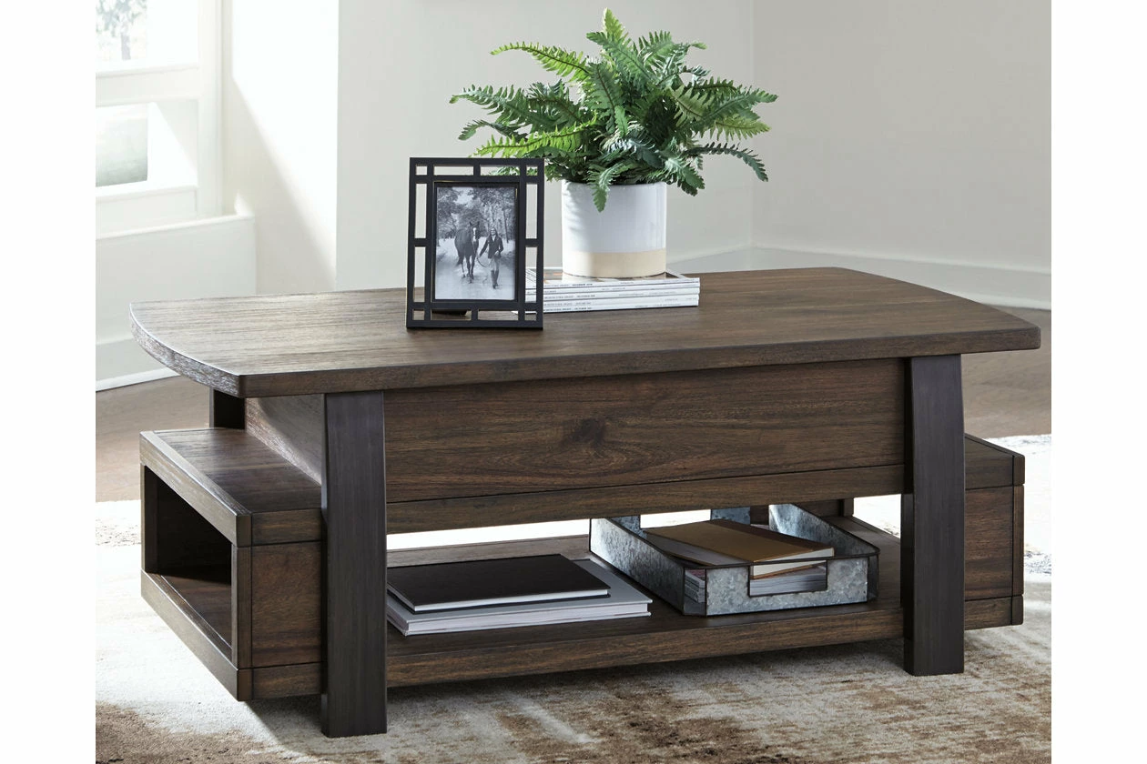 A table with form and function, and a whole lot of style, is what this amazing lift top coffee table is all about. Its handy lift top, open lower shelf and signature side shelves offer lots of convenient spots to keep the room’s necessities. The distressed brown finish contrasts beautifully with the dark brown faux metal finished legs for a floating top look that’s striking—quite a value for a style that will withstand the test of time.