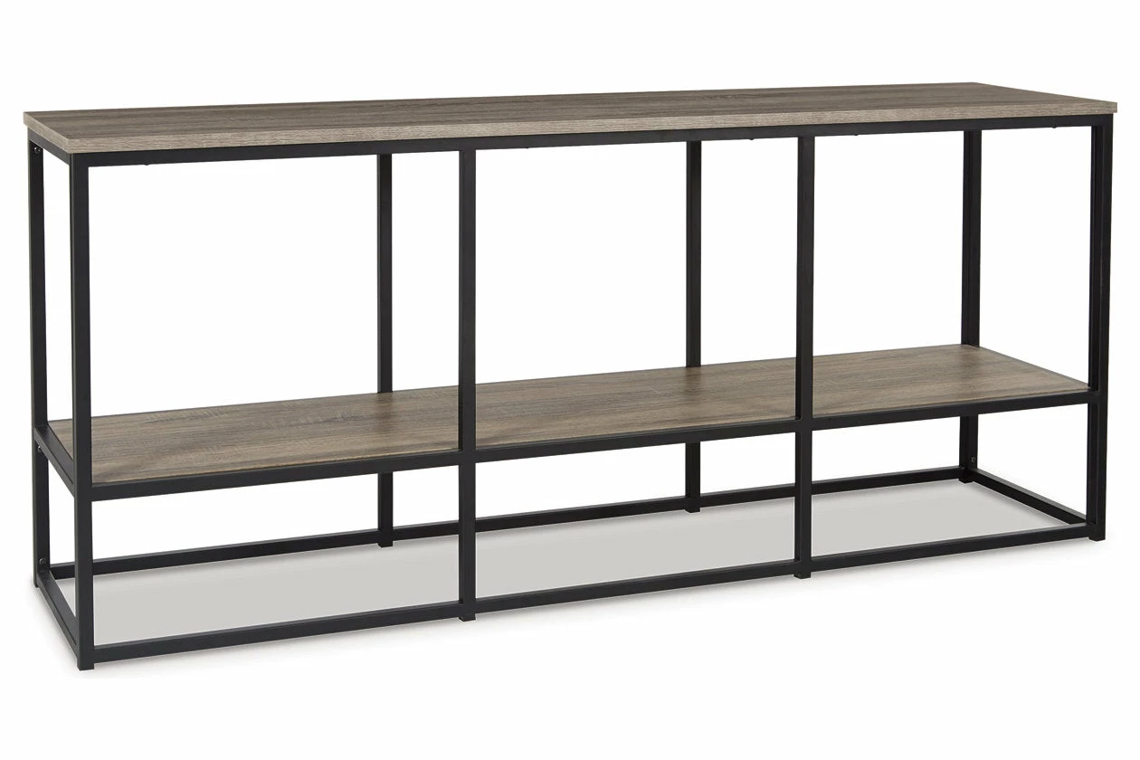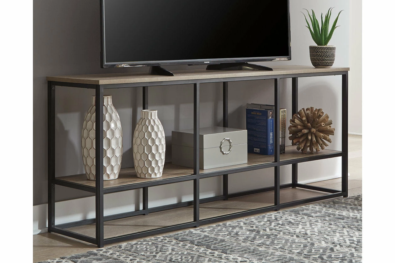 Making a great case for casual contemporary design with an urban attitude, this highly versatile TV stand is loaded with possibilities. Its cool combination of weathered replicated wood grain and linear black metal is a mastery in open-concept styling.