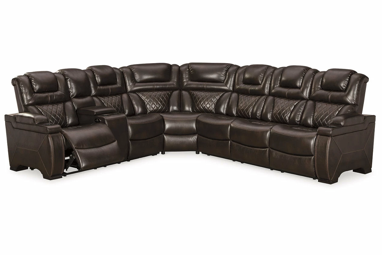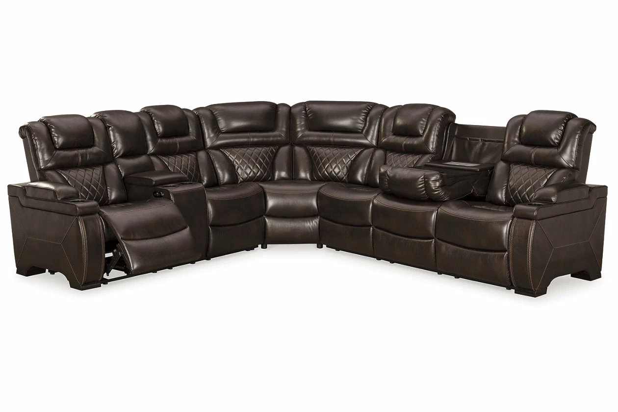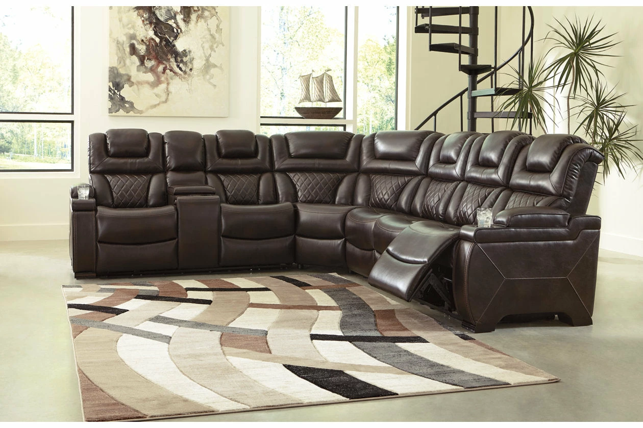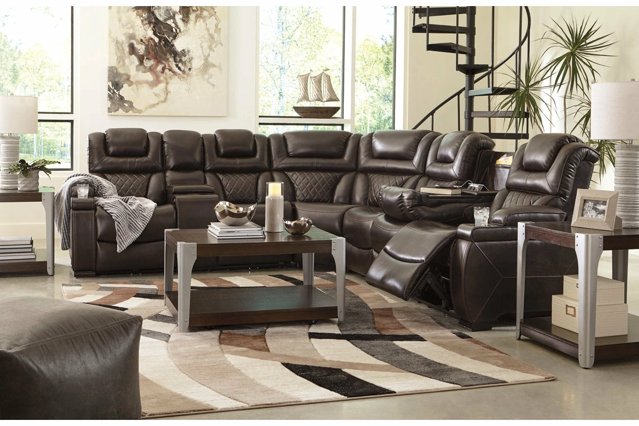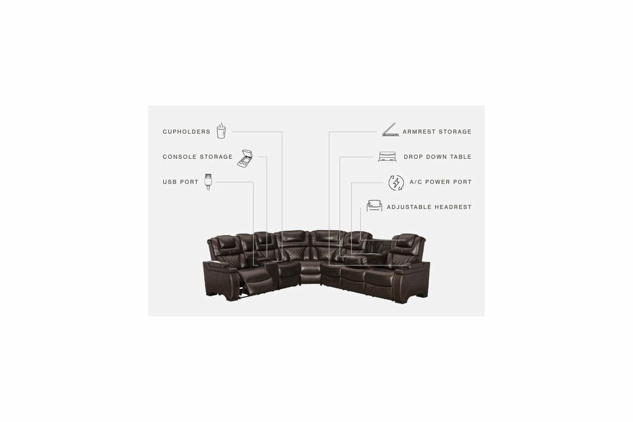 Your modern living room awaits with this power reclining sectional. Complete with practical faux leather upholstery, one-touch power controls, adjustable headrests and USB ports, it makes finding the best seat in the house a breeze. Flip-top armrests, a roomy storage console and cup holders galore keep drinks, snacks and remotes close by. Go ahead—treat yourself to a high-design home theater experience, priced to put you at ease.