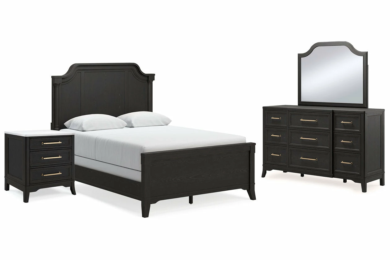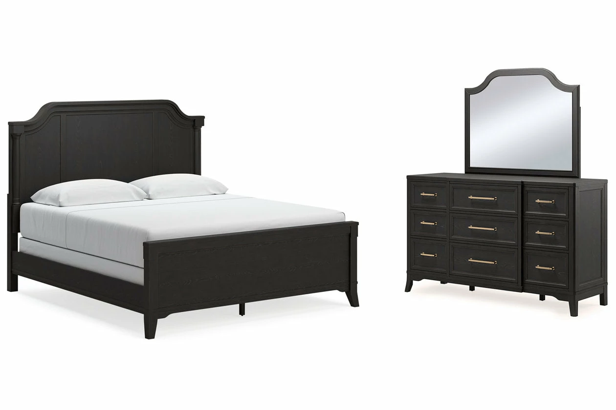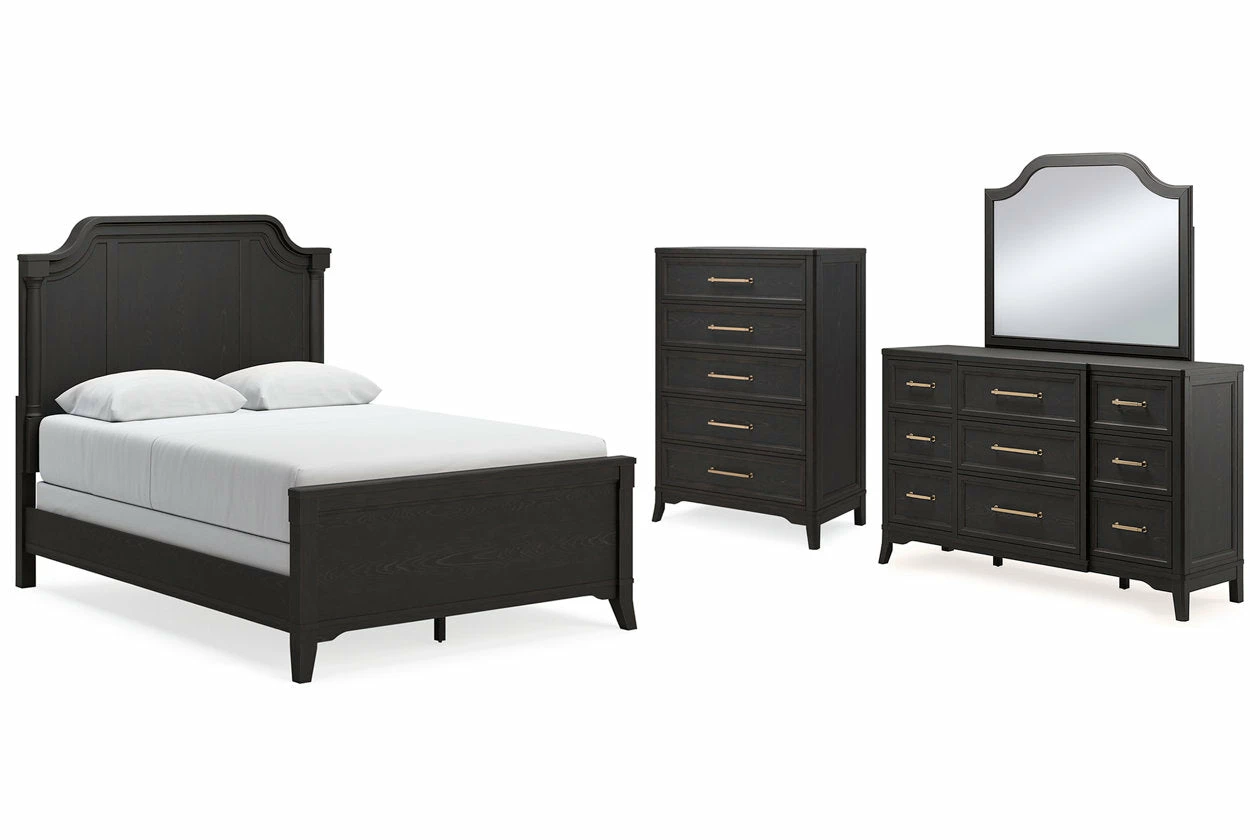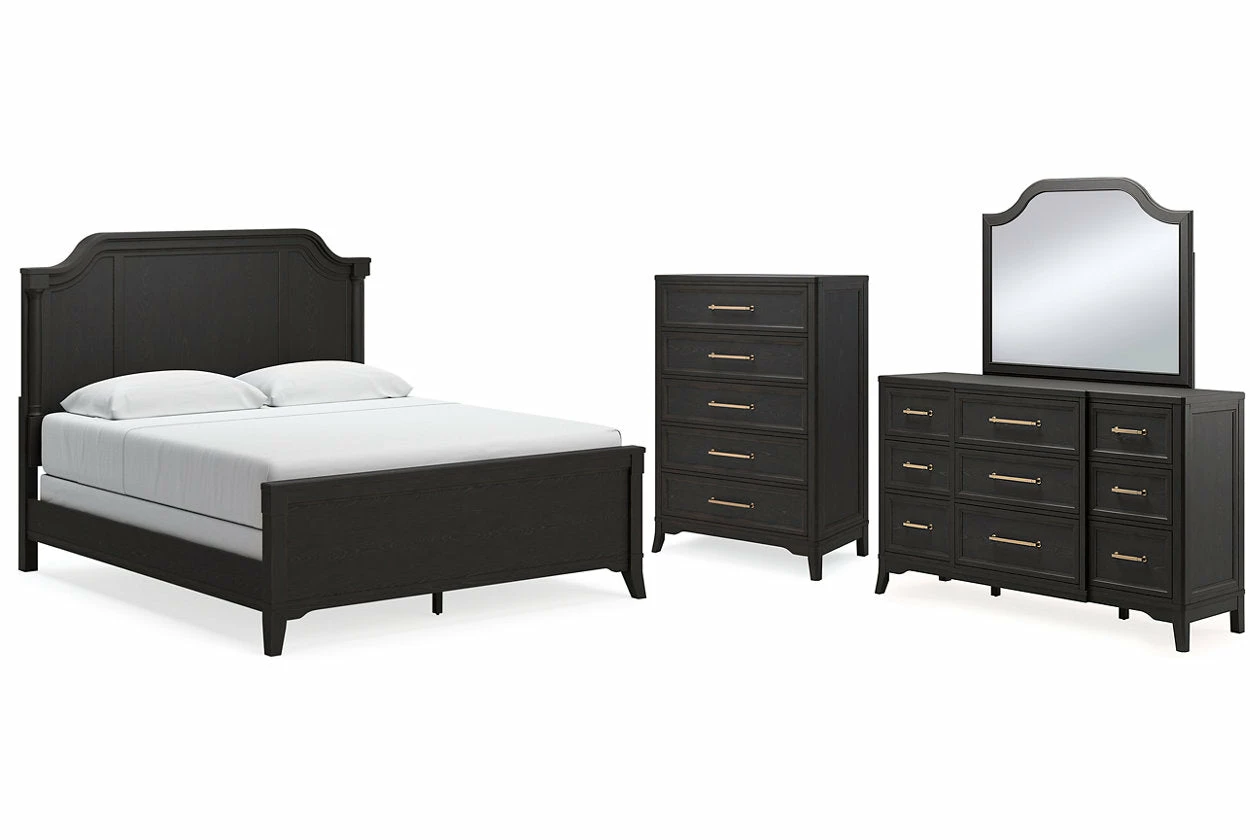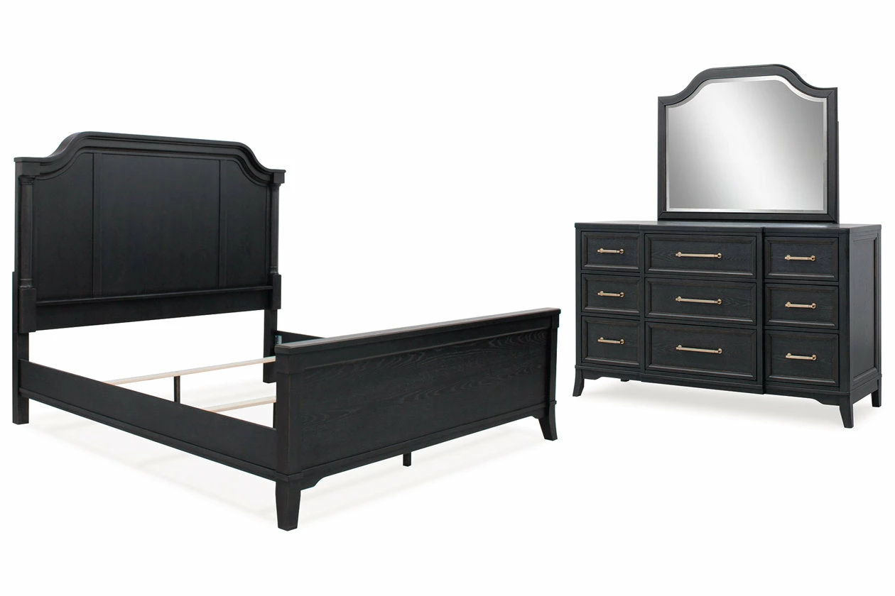 For those who love the classic profiles of traditional design—but want to forego the overly formal details—behold this bedroom package. Saber legs set with shaped lower aprons add a distinctive touch. A rich black finish on the textured wood grain surface with rubbed-through edges offers a subtle sense of gently aged charm. What a beautiful take on urban revival design.