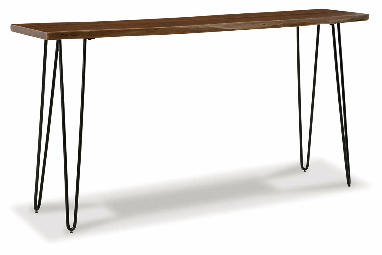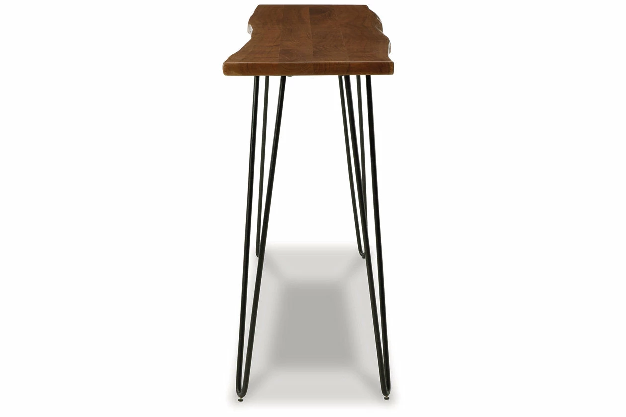 This stunningly simple solid mango wood dining table works effortlessly with contemporary decor. This narrow counter height table is perfect for smaller dining spaces. Or for added function, place it behind a sofa or sectional to make the most of your family room. The tabletop’s gorgeous, natural-looking color contrasts nicely with the matte black metal legs, providing an instant upgrade to your space.
