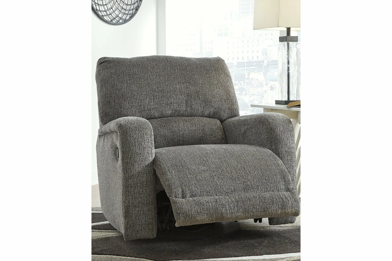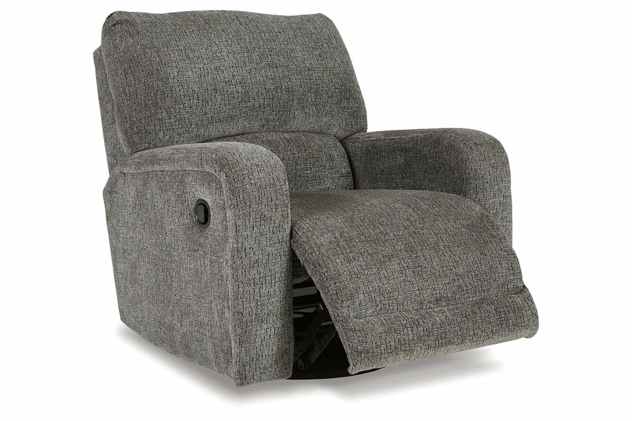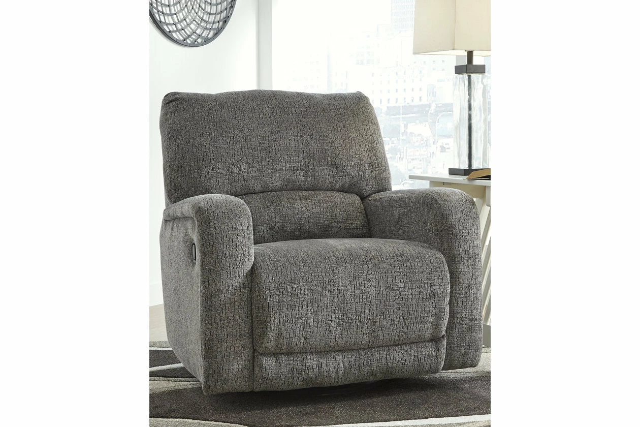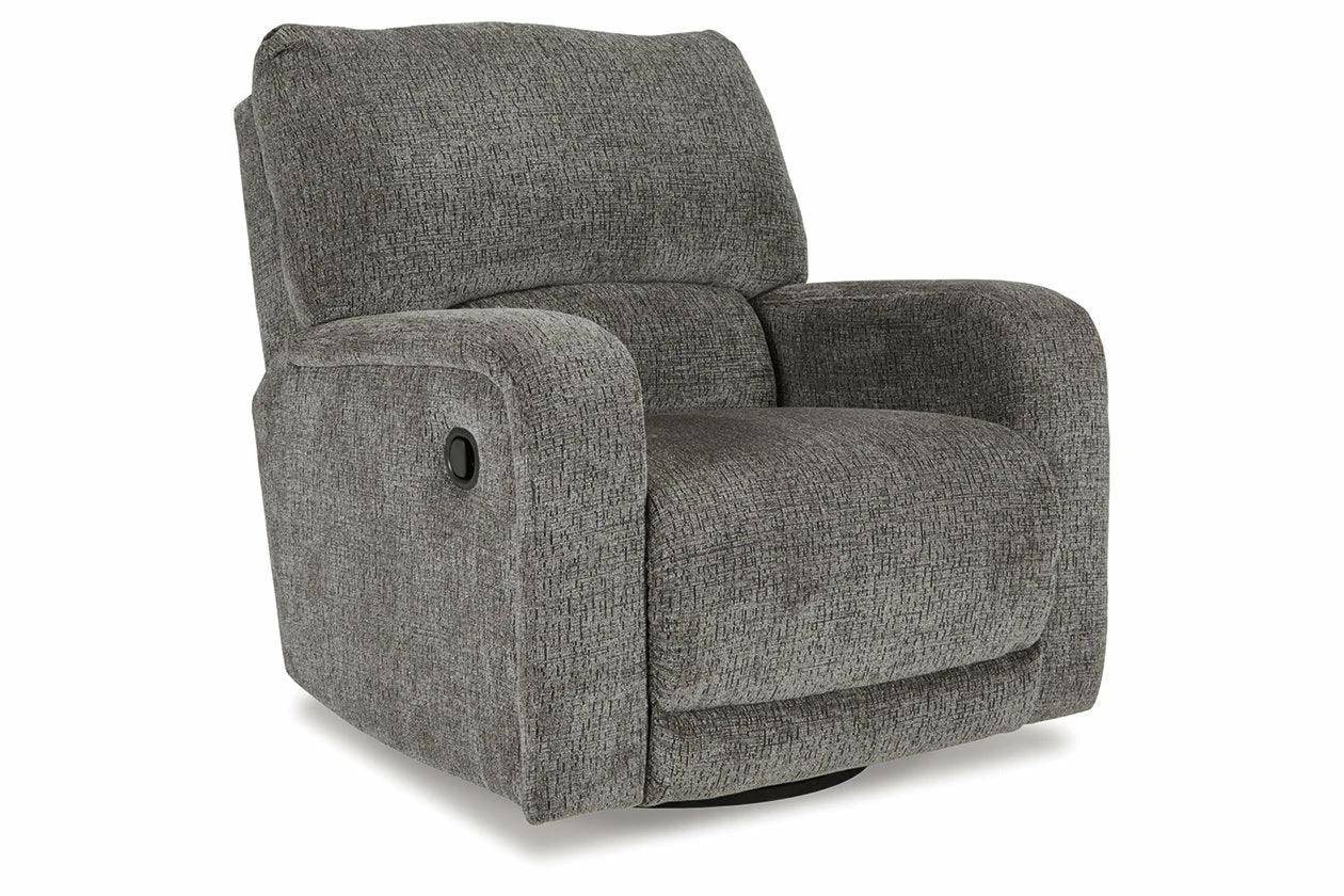 You and plush cushions are two peas in a pod. That’s why this swivel glider recliner will quickly find its way to your heart. Chenille fabric feels so good, you’ll never want to take your hands off of it. Track arms elevate the look with a touch of contemporary sensibility. Ease back into relaxation on the deep seating with one easy pull. Complete with 360-degree swivel, this recliner sets the bar for comfort.