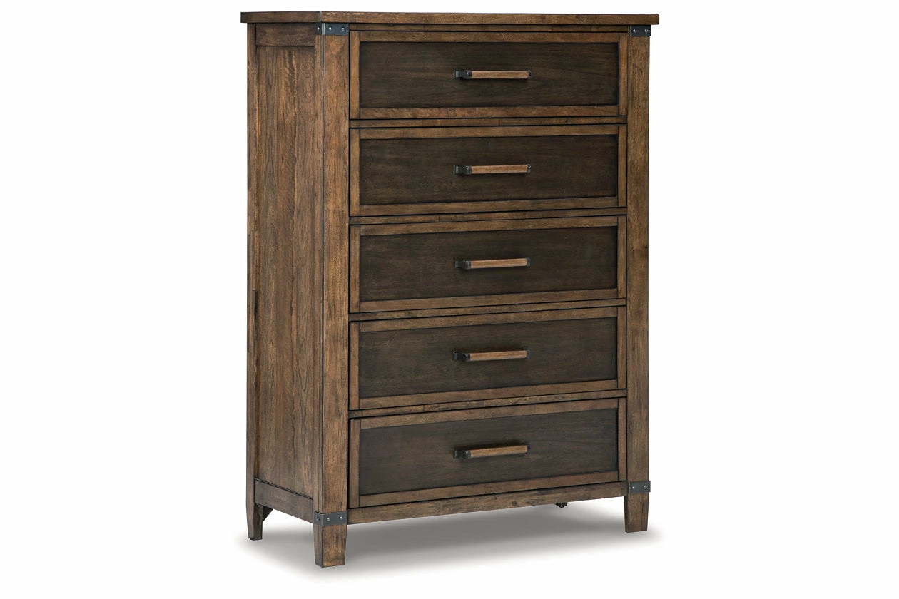 What a fresh interpretation of casual lifestyle design. Inspired by American craftsmanship, but with an elevated sensibility, this chest of drawers blends distinctive details such as metal corner accents and smooth-gliding drawers for an easy-living aesthetic. Those who appreciate the beauty of wood will be doubly impressed with the two-tone walnut and burnt umber finish that imparts an added level of refinement.