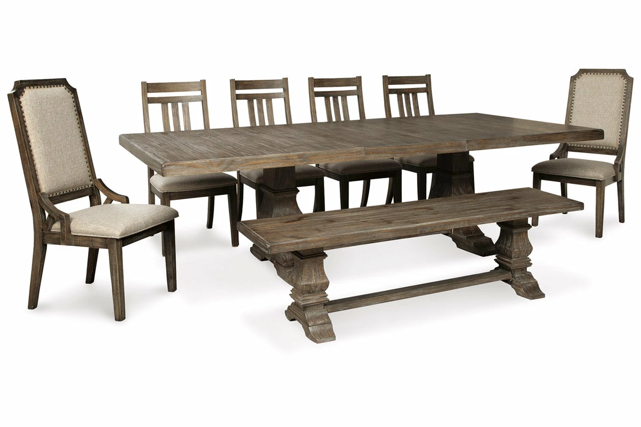 Inspired by heavy and hearty lodge-style furnishings from days gone by, this 6-piece dining set brings the past brilliantly into the present. Enticing with a distressed aged pine color finish with light wire-brushed texture, the richly-styled extension table and bench—both with drop-in leaf and double pedestal base—and dining chairs with bent slat design and textural beige upholstery are reserved for those who appreciate furniture with great presence.