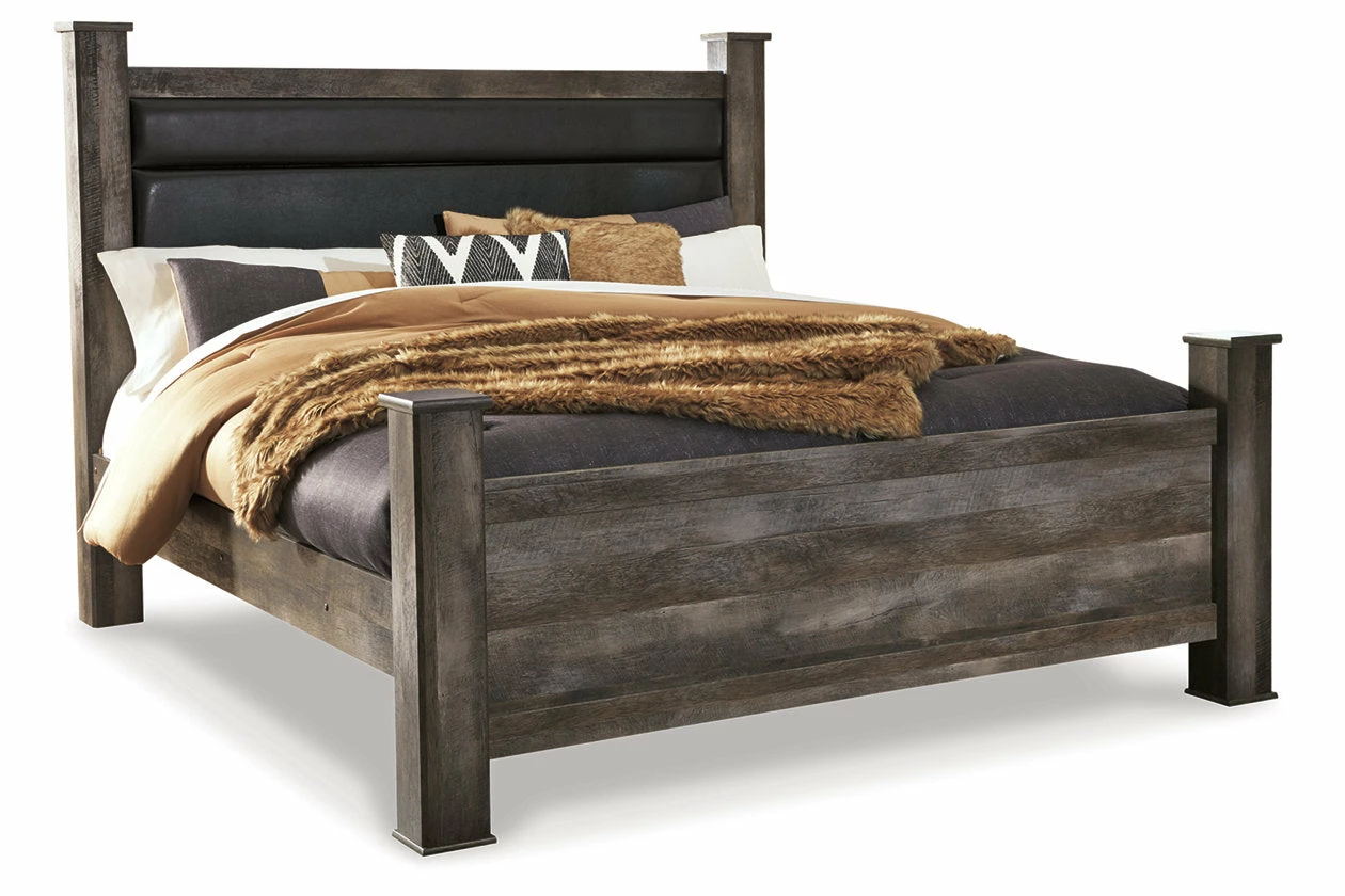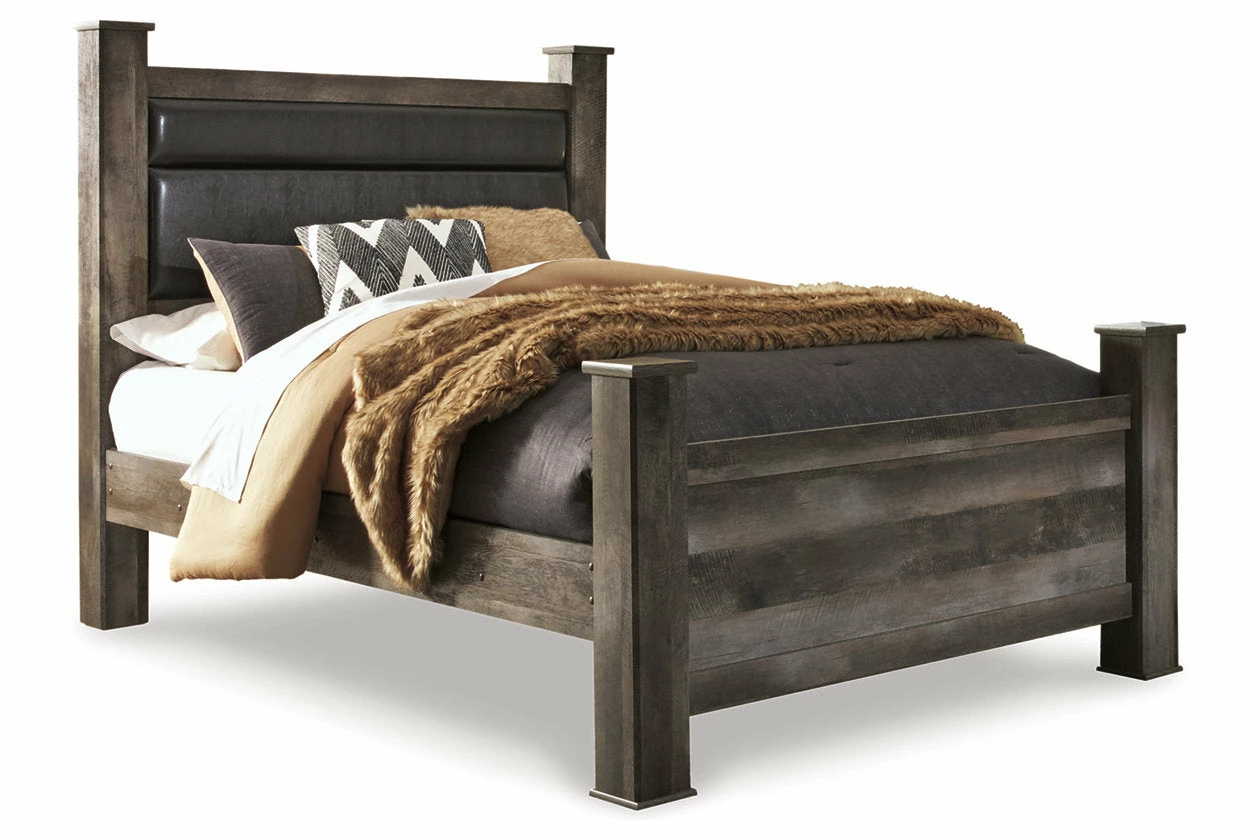 This queen upholstered poster bed is sure to win your heart with its daring designer take on modern rustic. The crisp, clean and minimalist-chic profile is enriched by a striking replicated oak grain with thick plank styling and a weathered gray finish for that much more authentic character. A padded black faux leather upholstered headboard with deep channeling adds flair and a sumptuous feel.