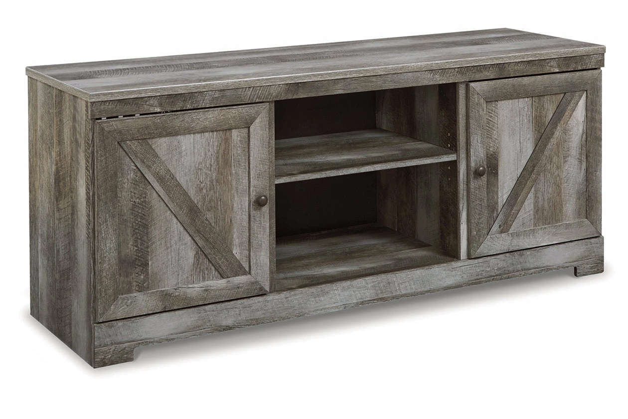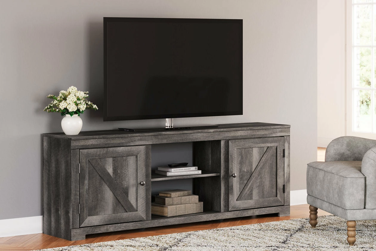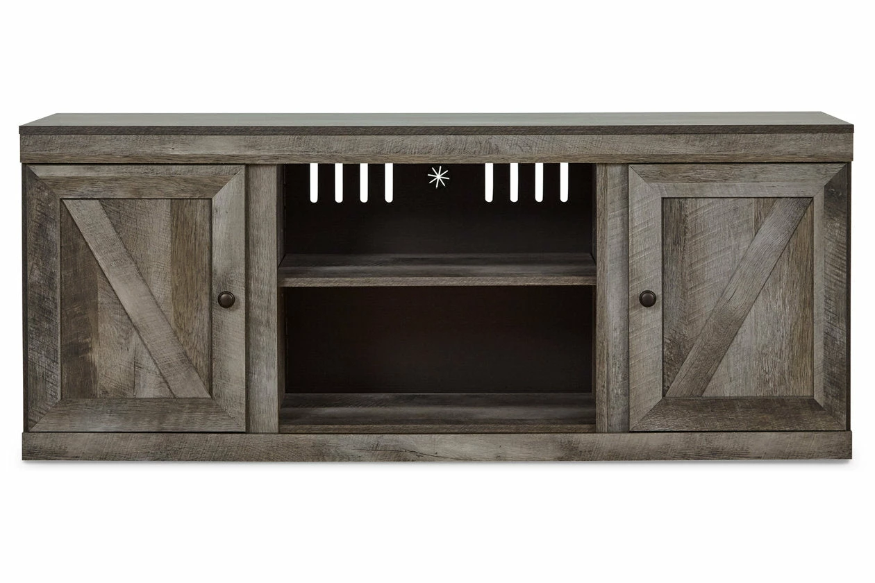 This TV stand with LED fireplace insert is sure to win your heart with its daring designer take on country living. Its crisp, clean and minimalist-chic profile is enriched with a gray finish, striking replicated oak grain and thick plank styling for that much more authentic character. Crossbuck detailing adds a brilliant barn door-inspired touch. What really turns up the heat: an electric infrared fireplace insert with faux firebrick surround that operates with or without infrared heat and includes a multi-flame feature, 7-level temperature setting, five brightness levels and an LED glowing embers effect.