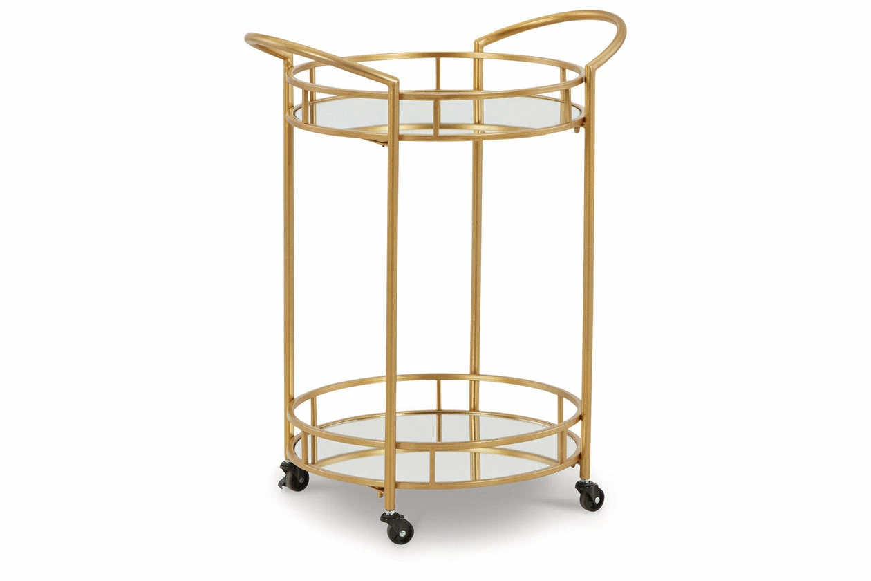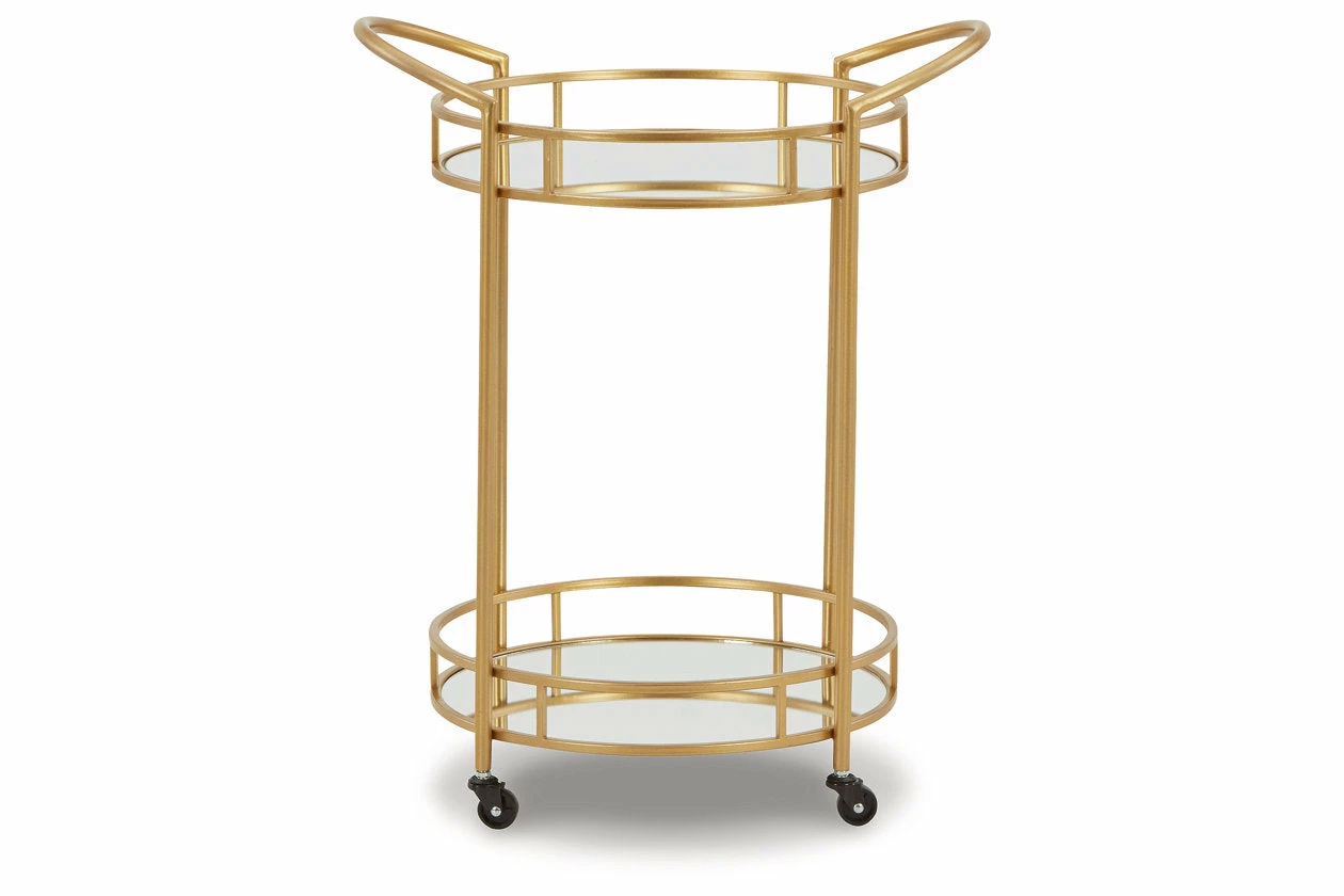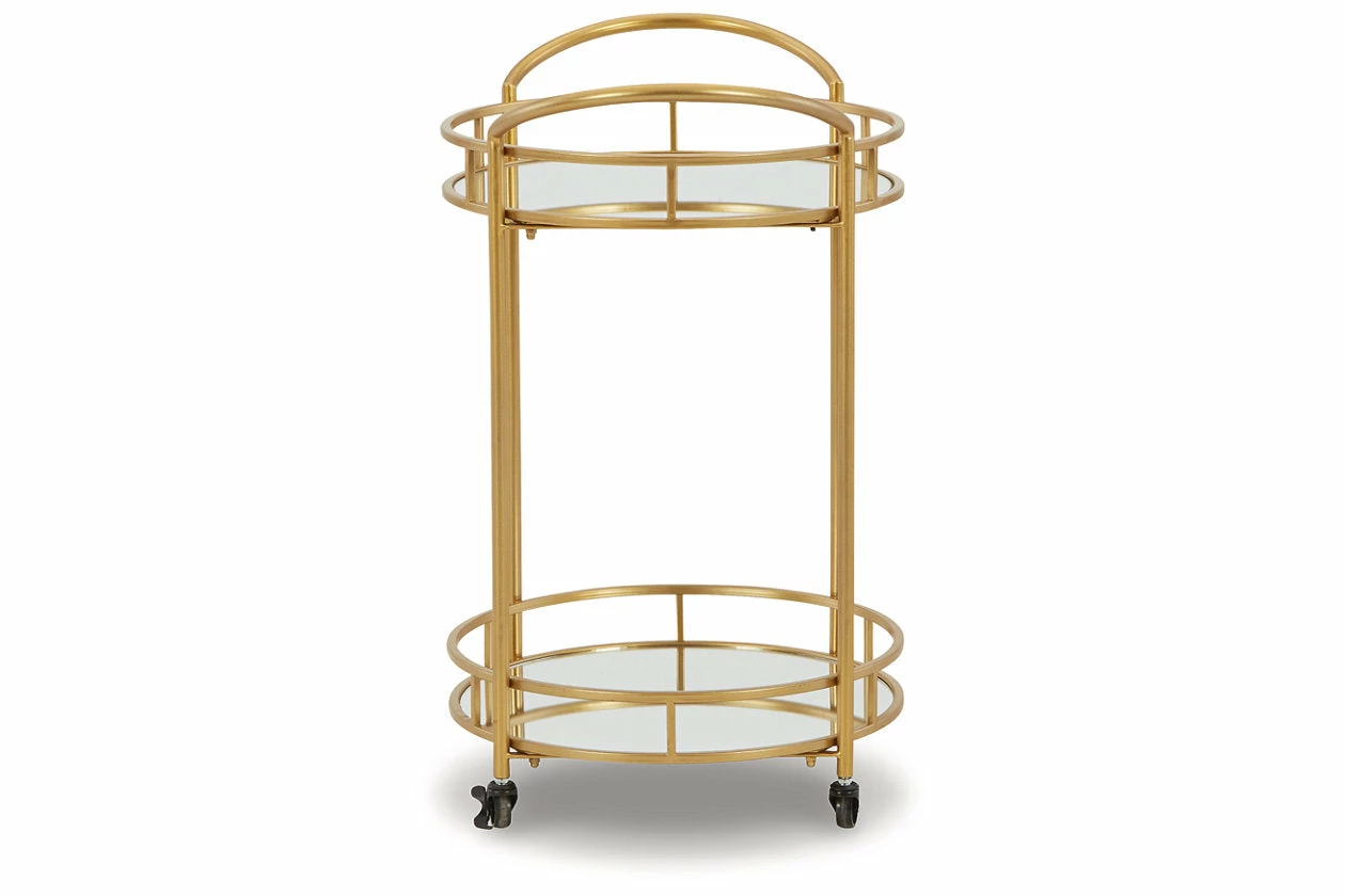 Add a bright spot to your contemporary space with this bar cart. Its beautifully bold blend of goldtone metal and mirrored glass heightens your home’s modern aesthetic. It’s a striking choice for your kitchen or entryway, with locking casters allowing you to serve in style whenever and wherever it’s needed.