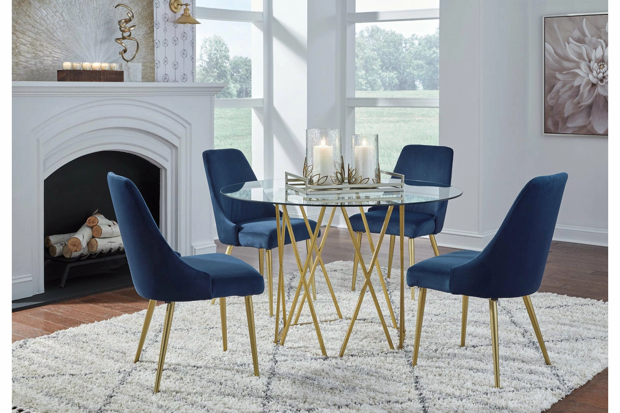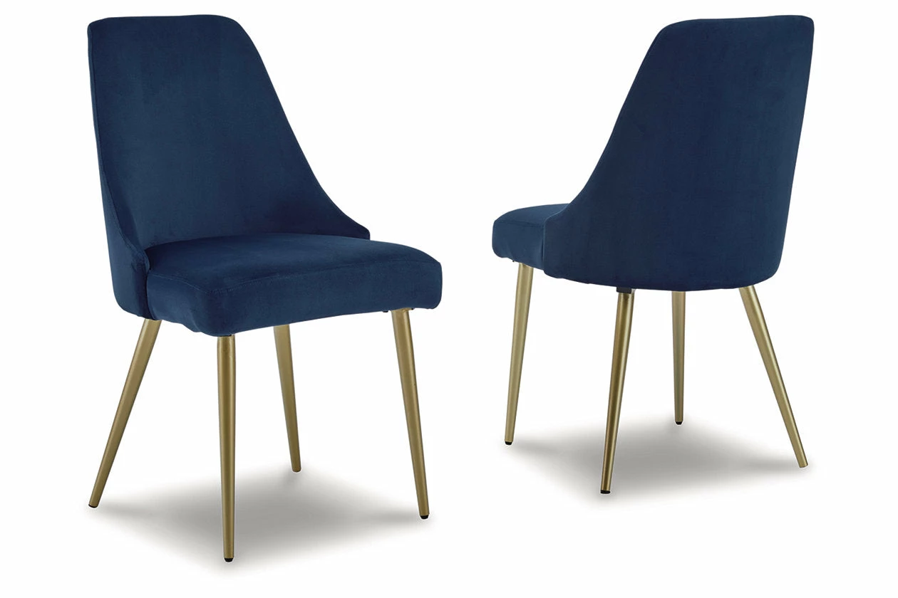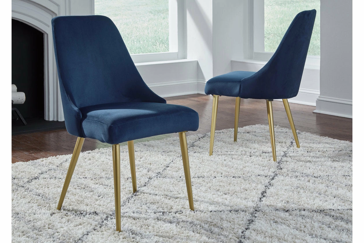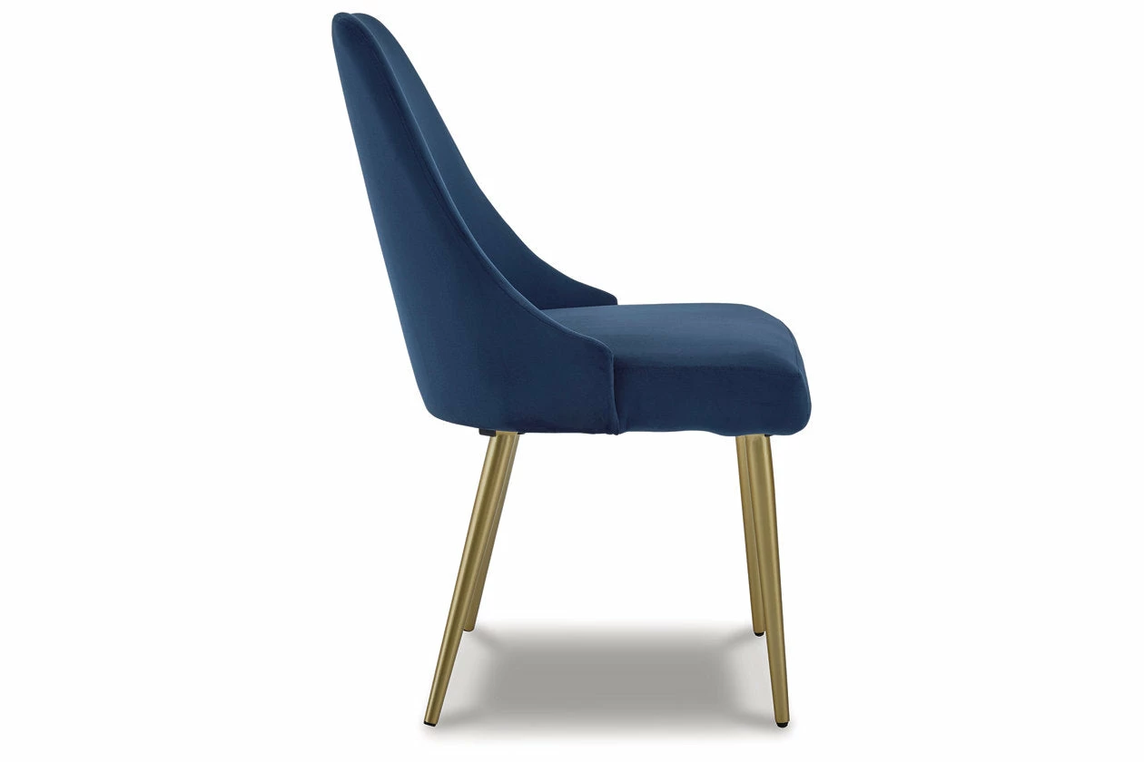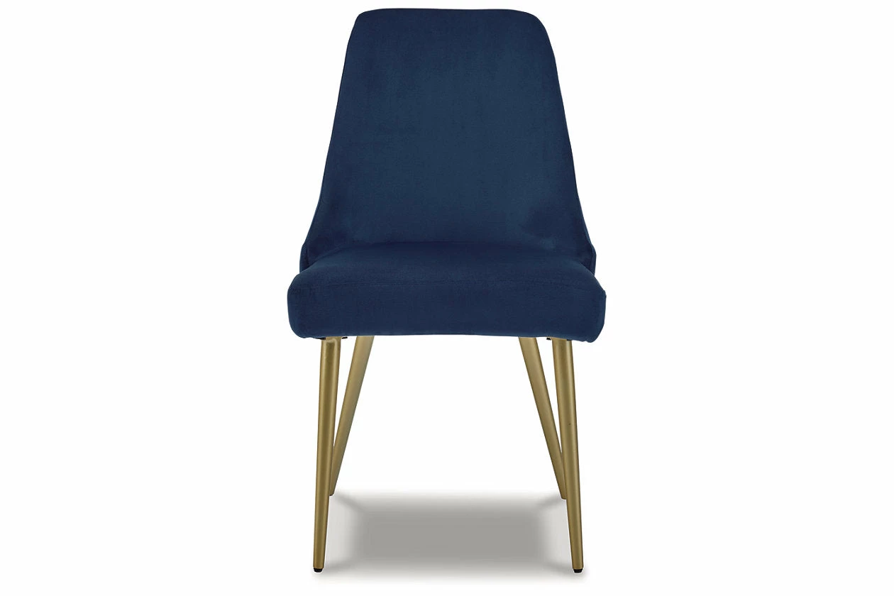 This bucket chair pairs modern contemporary design with the cushioned comfort of an upholstered dining room chair. Gleaming goldtone legs paired with bold blue velvet make for a lustrous look that’s fresh and forward-thinking. Use this chic seat anywhere in need of a touch of bling.