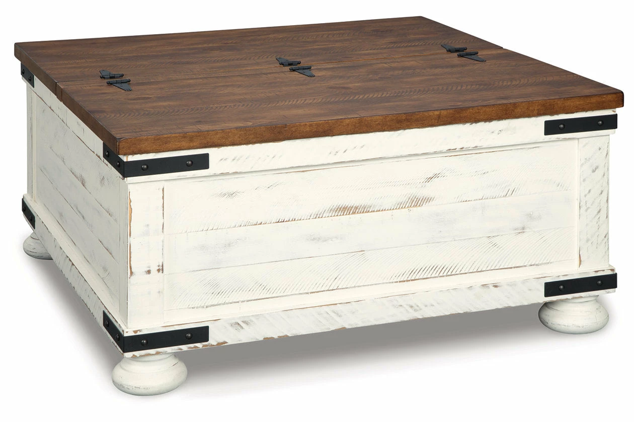 Double take. Sporting a two-tone finish, dual-sided lid design and expansive storage space, this square coffee table takes the art of rustic farmhouse living to a new level. Designer touches include plank-effect styling, heavy distressing and industrial bracket hardware.