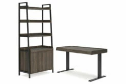 Craft a decidedly modern home office with this home office package. Its rich dark brown wood grain pattern has an air of refinement, while assorted shelves and drawers keep your workspace essentials organized in sleek style.