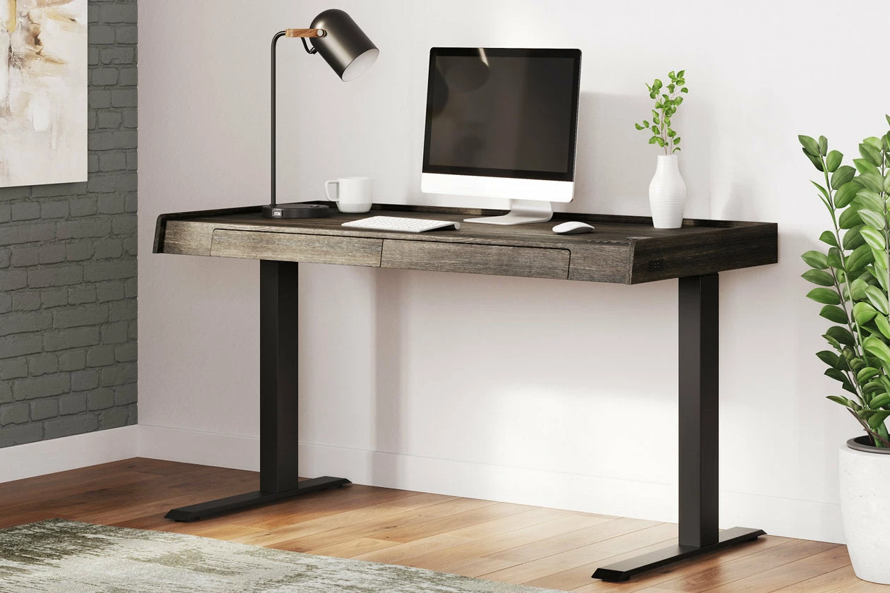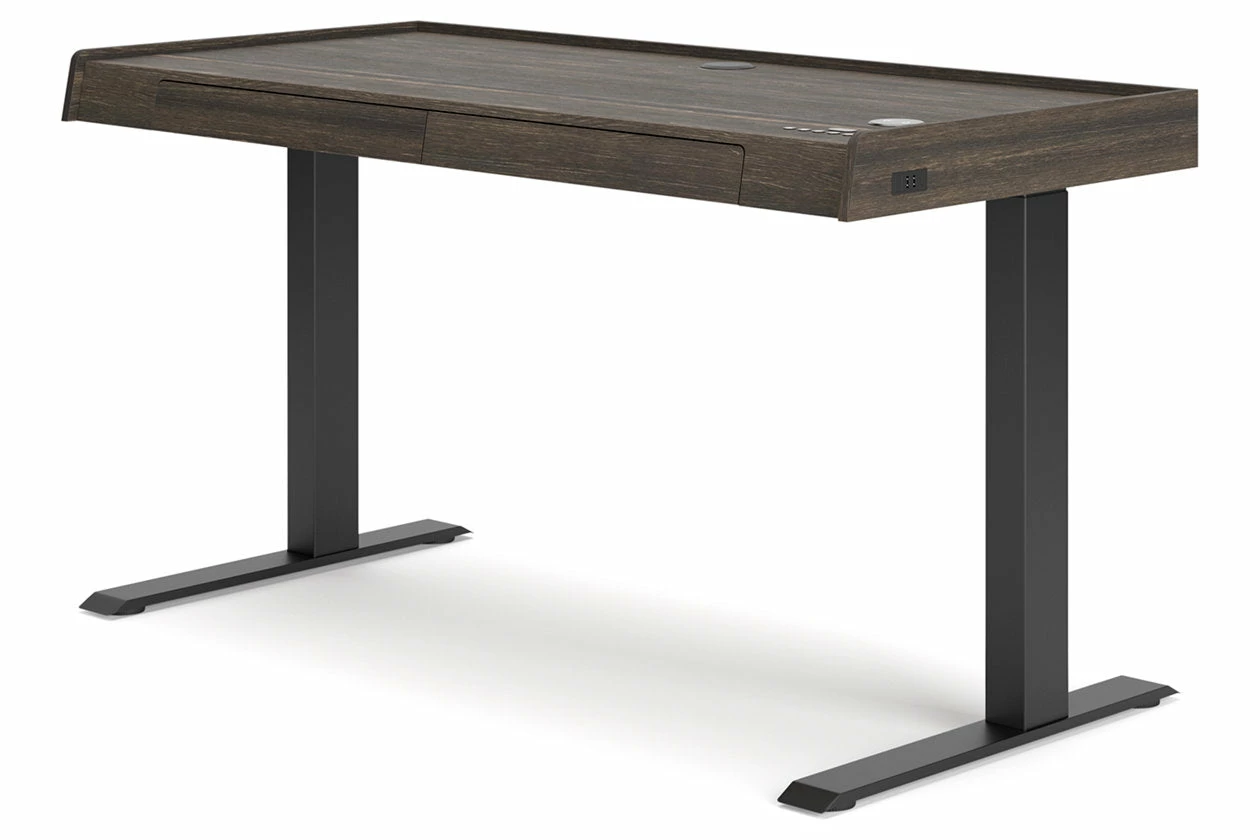 Craft a decidedly modern home office with this adjustable height desk. Its rich dark brown wood grain pattern has an air of refinement, while the two drawers keep workspace essentials organized in sleek style. Programmable height positions—along with USB, USB-C and wireless charging—round out this clean-lined, contemporary piece.